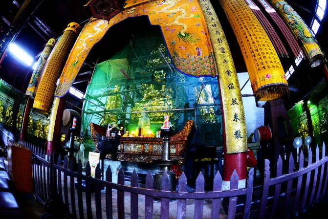 大雄寶殿內(nèi)正中的蓮花寶座上端坐著釋迦牟尼佛銅像,高6.8米,重十三噸,為明朝所鑄。兩旁站著阿難、迦葉兩弟子,前面站著旃檀佛。左右兩壁是元朝用楠木雕成的十八羅漢。都是些重量級(jí)的文物啊?,F(xiàn)在佛像上搭起了腳手架,正在貼金。