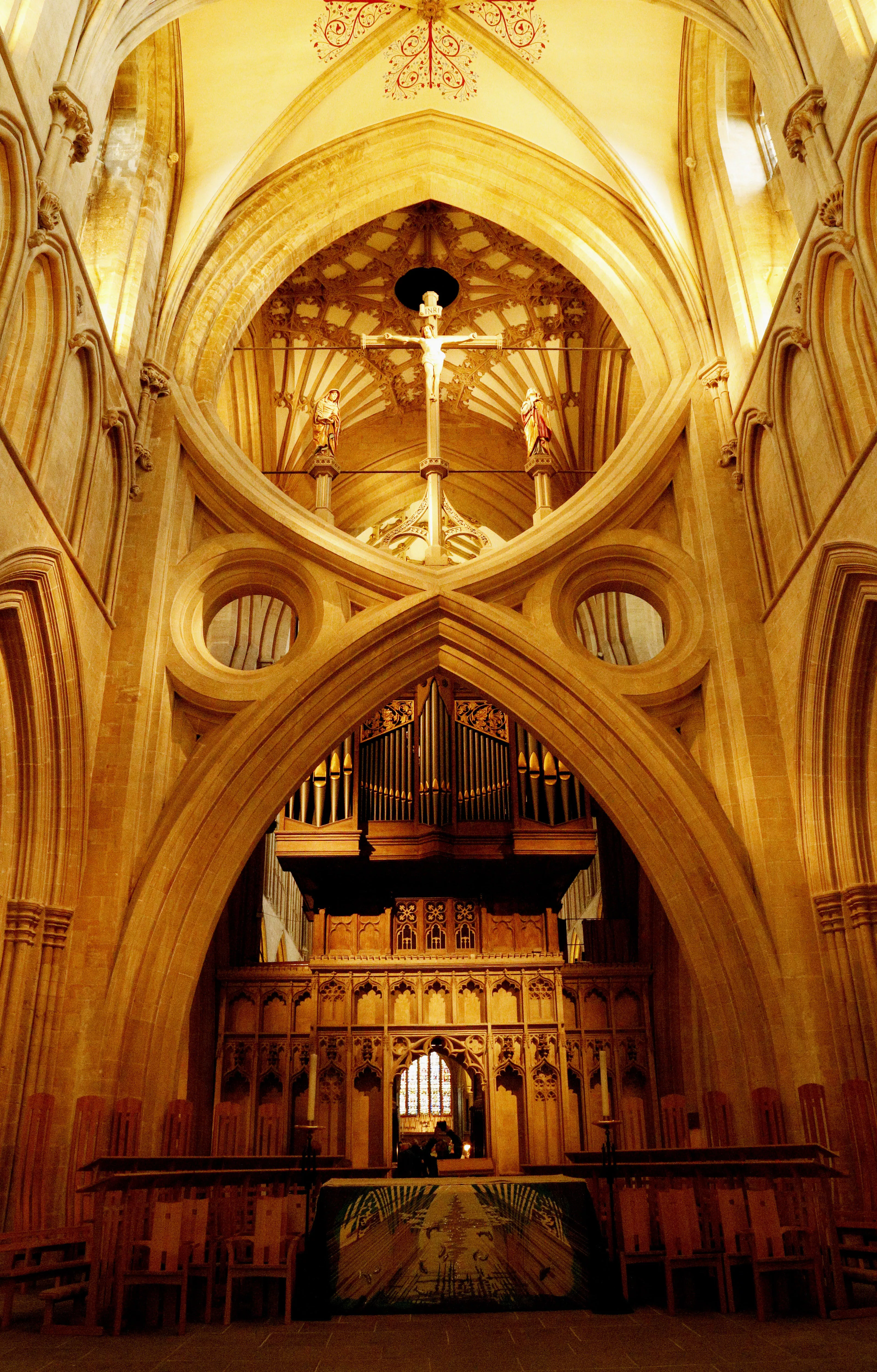 莊嚴(yán)凝重的韋爾斯大教堂,坐落于一個(gè)讓人驚嘆的圍庭內(nèi),從1180年到1508年的300多年間,大教堂分階段逐步建成。這幢建筑融合了豐富的哥特式建筑藝術(shù)風(fēng)格,但最吸引人的莫過(guò)于精美的West front,也就是一座巨大的、超過(guò)300件雕塑作品的藝術(shù)館。這些雕塑大部分創(chuàng)作于13世紀(jì),但在1986年才重新獲得了往日的光彩。教堂內(nèi)最令人難忘的應(yīng)該是將中殿與唱詩(shī)席分隔開(kāi)的剪型拱璧,它完美解決了因?yàn)橹行乃浅两祹?lái)的問(wèn)題,在北面十字形翼部的上方是建造于1392年的精美機(jī)械鐘,也是英格蘭現(xiàn)存第二古老的大鐘。大鐘標(biāo)示出了各個(gè)行星的方位和月球所處的不同階段。