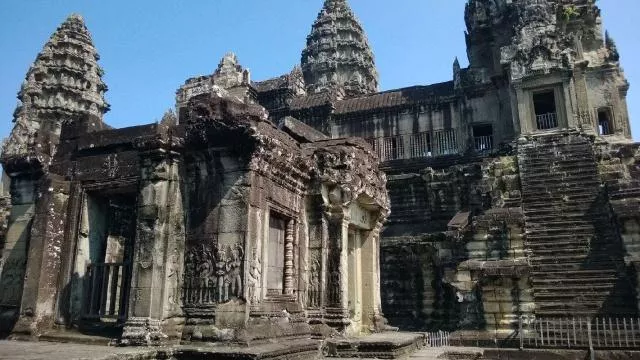 第三層:呈正方形,邊長(zhǎng)75米。這是神廟的最高層,四座小塔拱衛(wèi)中央主塔,象征著諸神居住的圣地須彌山。通向主塔的臺(tái)階被稱為“天堂階梯”,高13米,幾乎與地面垂直,攀登時(shí)必須手腳并用,信徒以此體會(huì)天堂之路的艱辛,表達(dá)無限虔誠(chéng)。 1973年,一名法國(guó)女游客在攀登中失足跌落致死,她的丈夫悲痛之余捐資在西面臺(tái)階一側(cè)修造了扶手。從此這一側(cè)階梯也被稱作“愛情階梯”。 介 紹 吳哥寺又叫小吳哥(與“大吳哥”通王城相對(duì)而言),通常所說的“吳哥窟”即指這里,因?yàn)樗菂歉绻袍E中最大、保存得最好、知名度最高的建筑,因此吳哥窟也被作為整個(gè)古跡群的總稱。它因宏大的規(guī)模、完美的對(duì)稱、均衡的比例、精致的浮雕被稱為古代東方的四大奇觀之一。