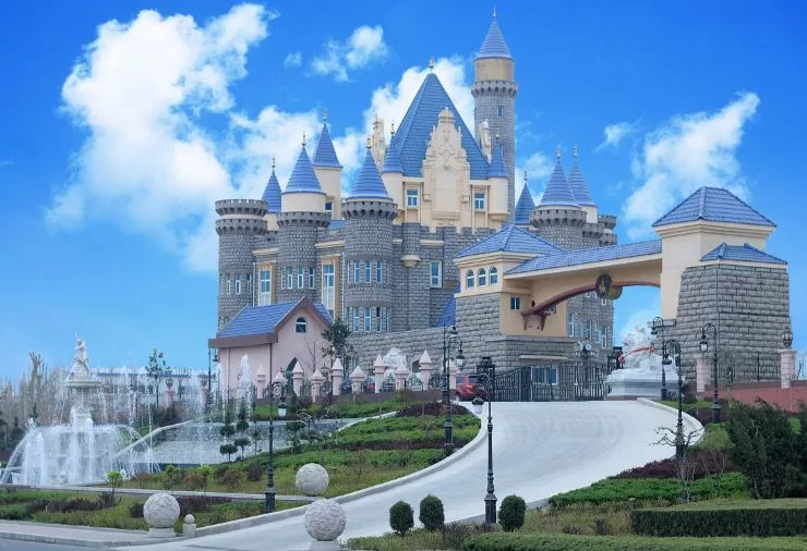 城堡以巴洛克風格為主,占地5000多平方米,共四層,以珍貴洞石為主的建筑材料承載著歐洲建筑和裝飾藝術的精髓,獨一無二的貴族氣息撲面而來。周圍還有護城河環(huán)繞,內裝海水,可養(yǎng)海參鮑魚,也可供人戲水劃船,情趣十足。