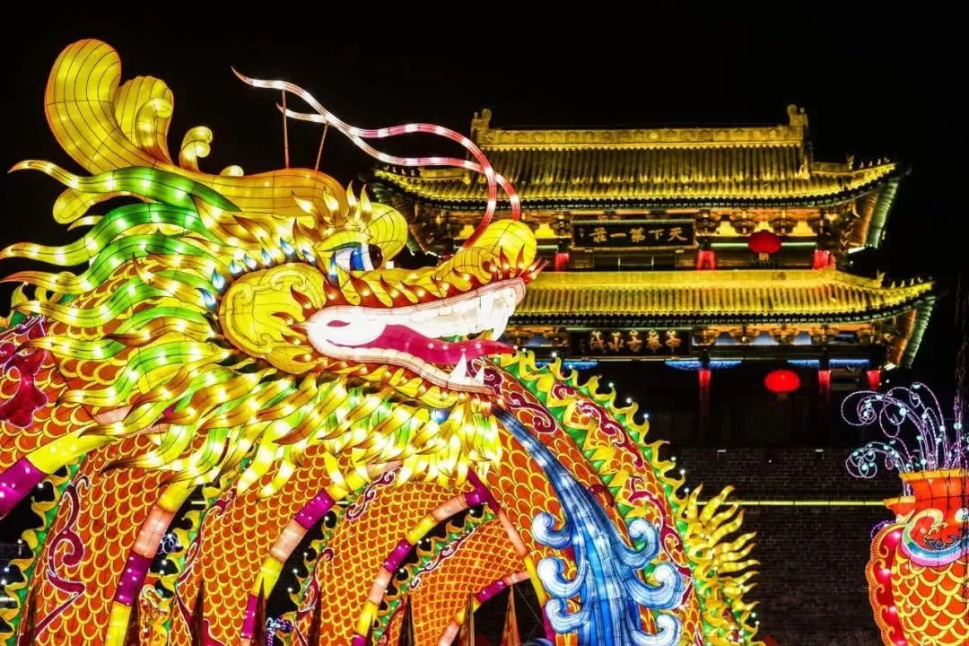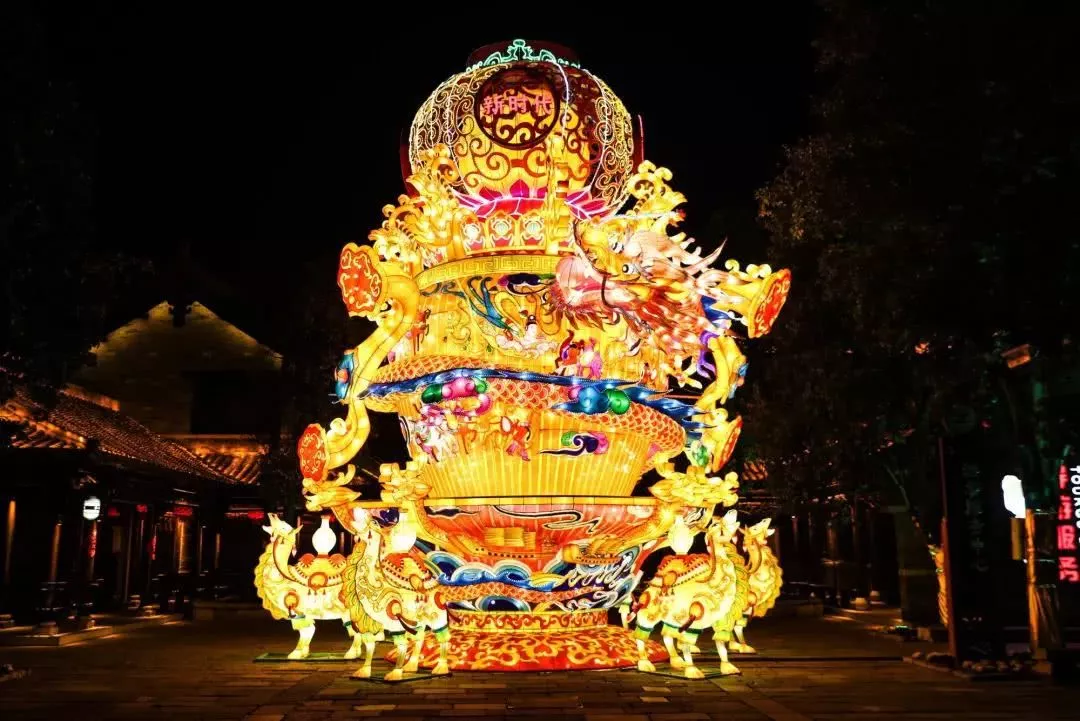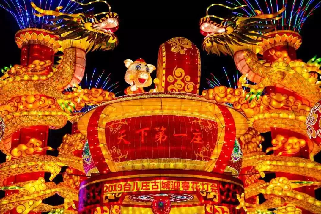 步入臺(tái)兒莊城西門,映入眼簾的是《福滿古城》花燈組,兩側(cè)的花燈高低不一,中間的花燈高近20米,花燈前后寫著“天下第一莊”幾個(gè)字樣,中間兩條造型特異的龍環(huán)繞著,端以豬為形象的花燈還可以來(lái)回?cái)[動(dòng),頗具看點(diǎn),預(yù)示著新的一年大家幸福滿滿。
