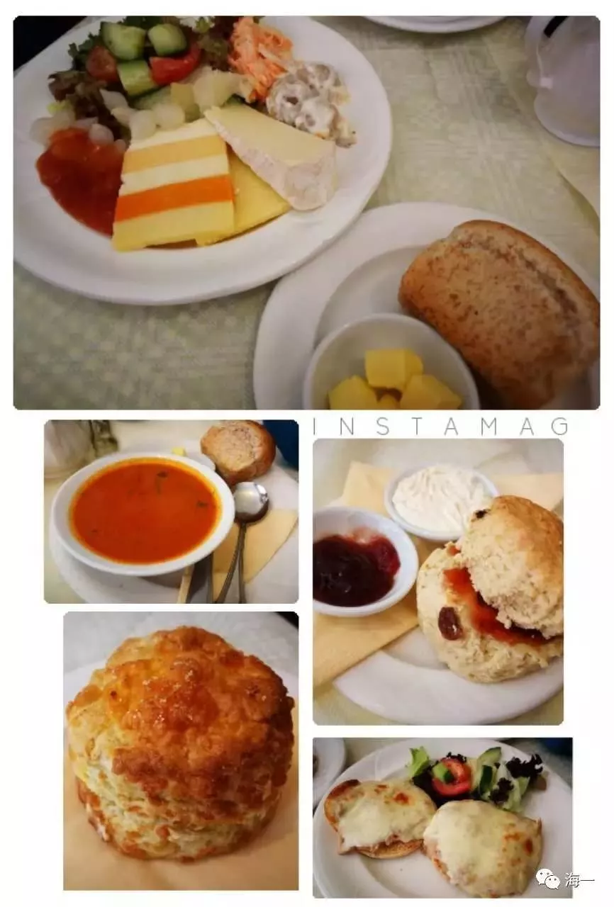 點的各種奶酪的拼盤,番茄濃湯,奶酪吞拿魚包,自家出品的各種口味的司康餅(scone)等,味道不錯。