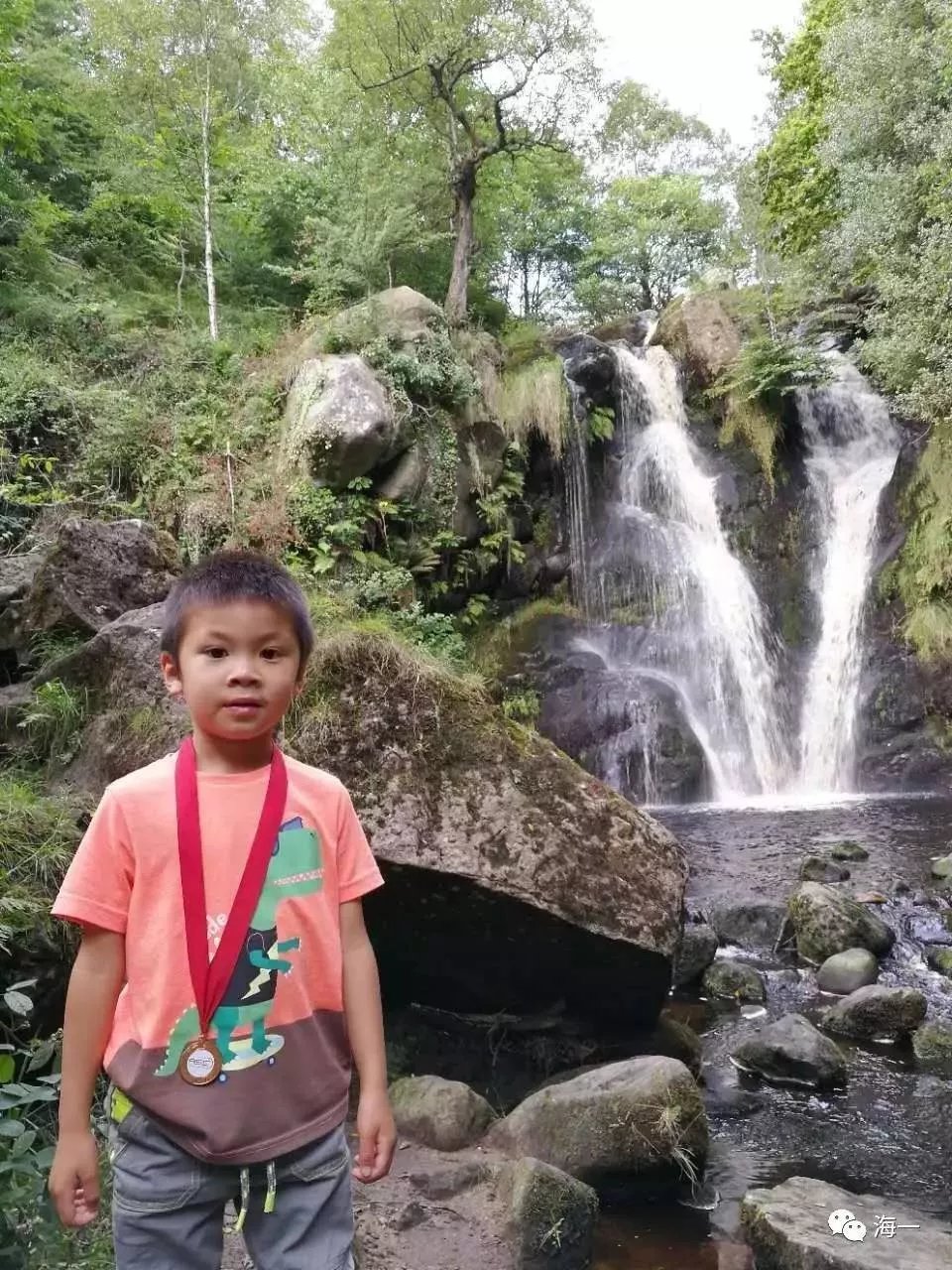 耶!終于走到瀑布啦!有一英里多的路程,上山又下山,泥濘的小路并不好走,小寶(四歲)一直戴著獎牌(之前參加夏令營得的)堅持走到終點棒棒噠!