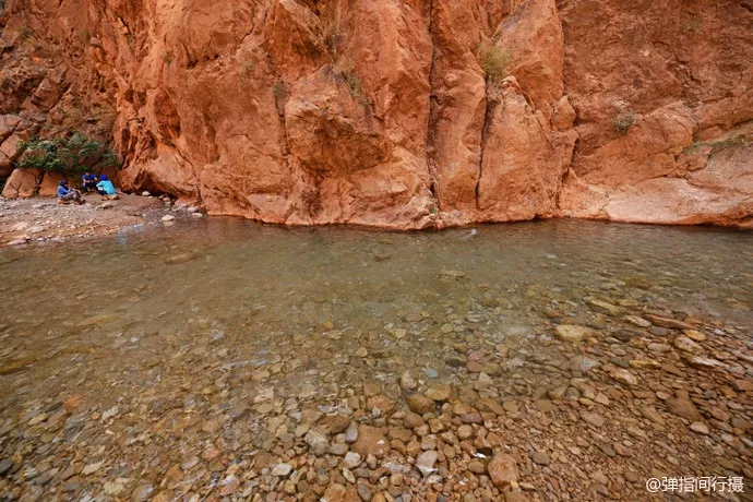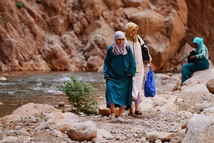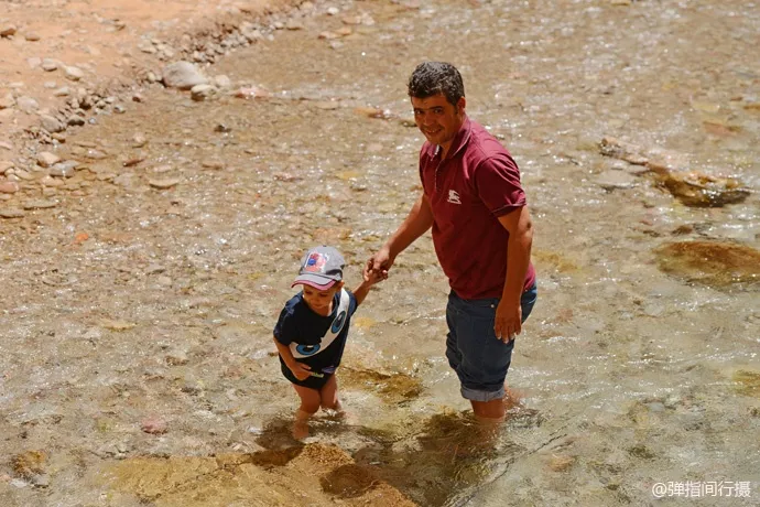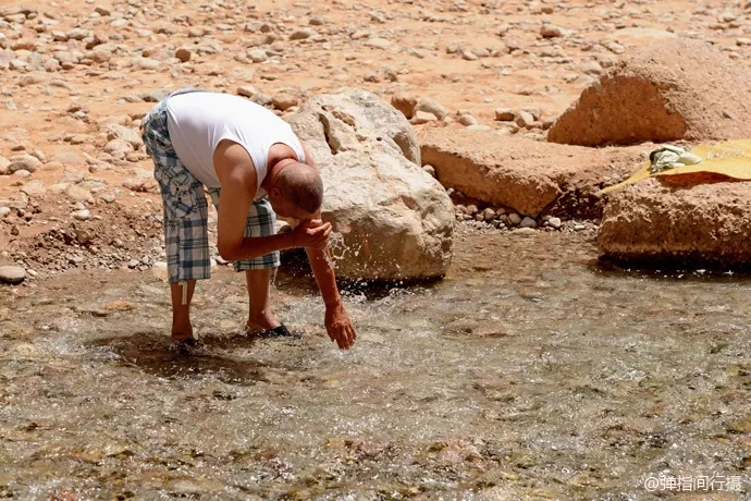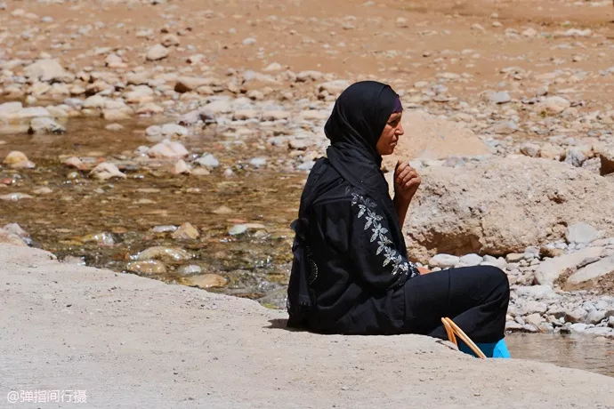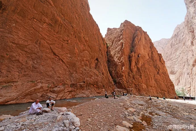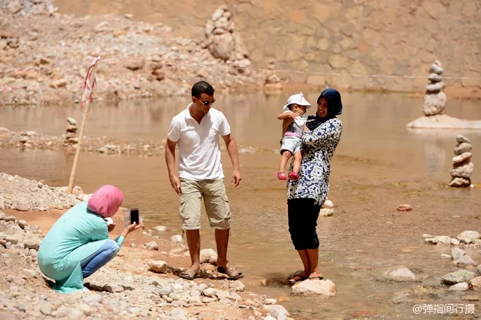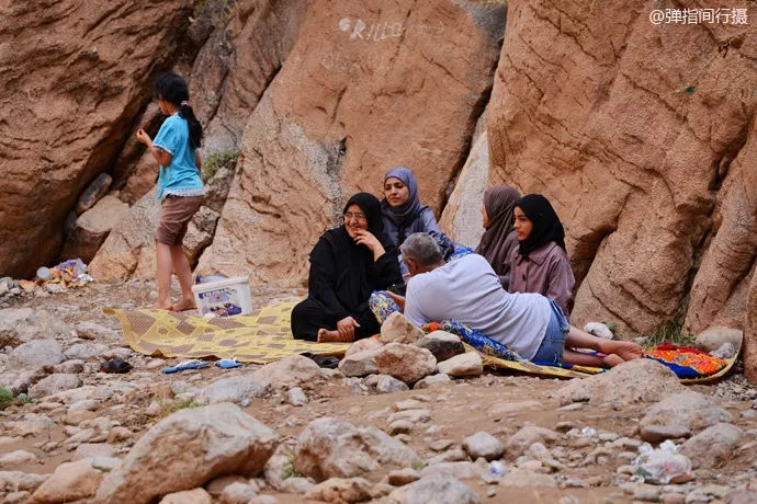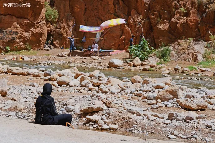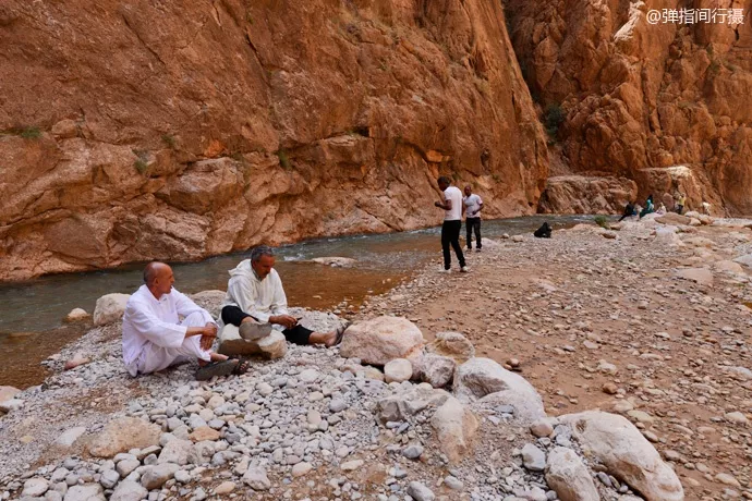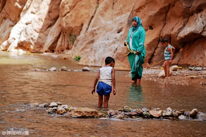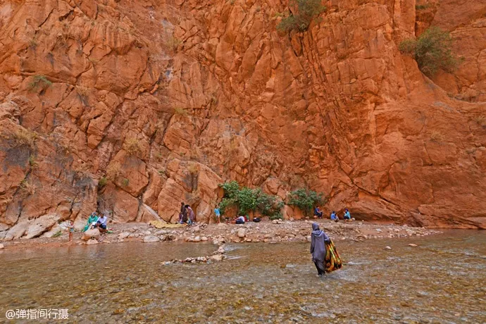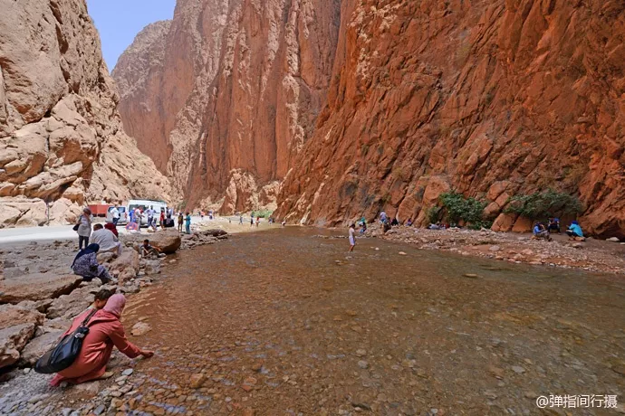 在谷底有一條細(xì)小的河流穿過(guò)而過(guò),旁邊是一條不算寬敞的路,車子能從這里穿過(guò)峽谷,我們也得以在此地停留,感受大自然的雄偉壯麗和鬼斧神工。在峽谷里的小河中,有許多當(dāng)?shù)厝嗽诖藨蛩藳?。?duì)于長(zhǎng)期生活在沙漠和戈壁,面對(duì)水資源匱乏的摩洛哥人來(lái)說(shuō),峽谷中這條河流絕對(duì)稱得上是平民的天堂,避暑的秘境。頂著灼燒的烈日,耐著45度的高溫,能在這處清涼的河水里洗洗臉、泡泡腳,不管是當(dāng)?shù)厝诉€是游客都是極其奢侈的享受。河水很淺,最深處只能沒(méi)過(guò)小腿肚,但當(dāng)?shù)厝硕技娂娬镜剿?,有些甚至整個(gè)人躺著,讓這難得的清涼感滲透全身。就連平時(shí)保守害羞的婦女,也忍不住包著裙衣站立其中,戲水納涼。