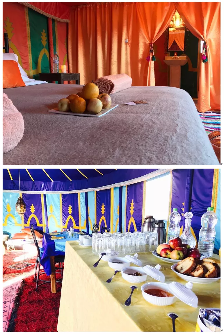 白色的帳篷是撒哈拉最好的帳篷。不僅成色較新,而且更上相一些。黑色的帳篷是低端帳篷的多一些。不過,大火ins的kamkam dunes也是黑色帳篷。黑色帳篷夏天吸熱會(huì)很明顯,在沙漠里溫度會(huì)高達(dá)40度以上。讓人難以忍受。因此每年6-8月份的時(shí)候,kamkam dunes會(huì)停止接待。等待盛夏過去了,才重新開放。