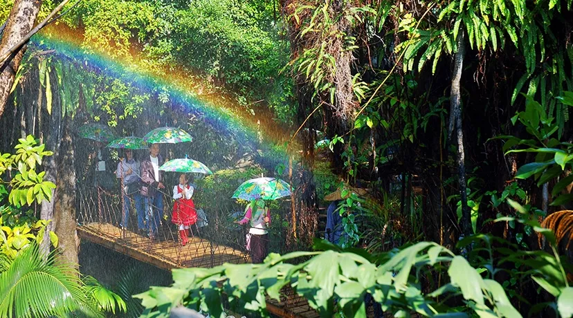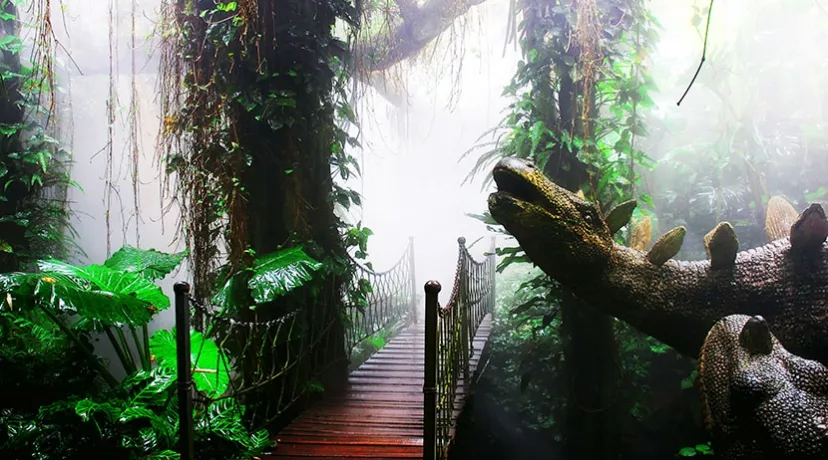 有“地球之肺” 之稱的熱帶雨林,物種豐富,是世界上生物學(xué)家、地理學(xué)家和探險家科研探索的樂園。走進青青世界霧氣繚繞、空氣甜美的雨林去探尋會爬樹的青蛙、會吃蟲的草、會變色的蜥蜴、來自亞馬遜河重達上百公斤的海象魚、獨木成林的大榕樹以及各種奇花異草。你會有剎那間“不知今夕是何時”的時空錯位之感。穿過雨林,登上彩虹橋,在愕然回首間,浮現(xiàn)的那 “水彩蠟筆和萬花筒也畫不出的天邊那一道彩虹”,不禁贊嘆大自然的美麗和神奇。
