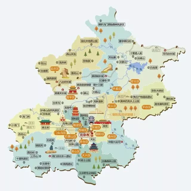 將日歷翻到2021年1月2日,一張北京地圖映入我們眼簾。它不僅囊括了北京下轄16個(gè)區(qū)的劃分,還包含了每個(gè)區(qū)最具代表性的自然人文景觀。