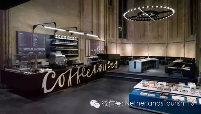登上三層黑色書架頂層,可近距離欣賞教堂穹頂上14世紀(jì)的壁畫,亦或俯視整個(gè)教堂。溫馨的咖啡角由原來的唱詩班區(qū)所改,餐桌為一個(gè)放平的十字架,深邃的空隙間放有各種報(bào)刊。