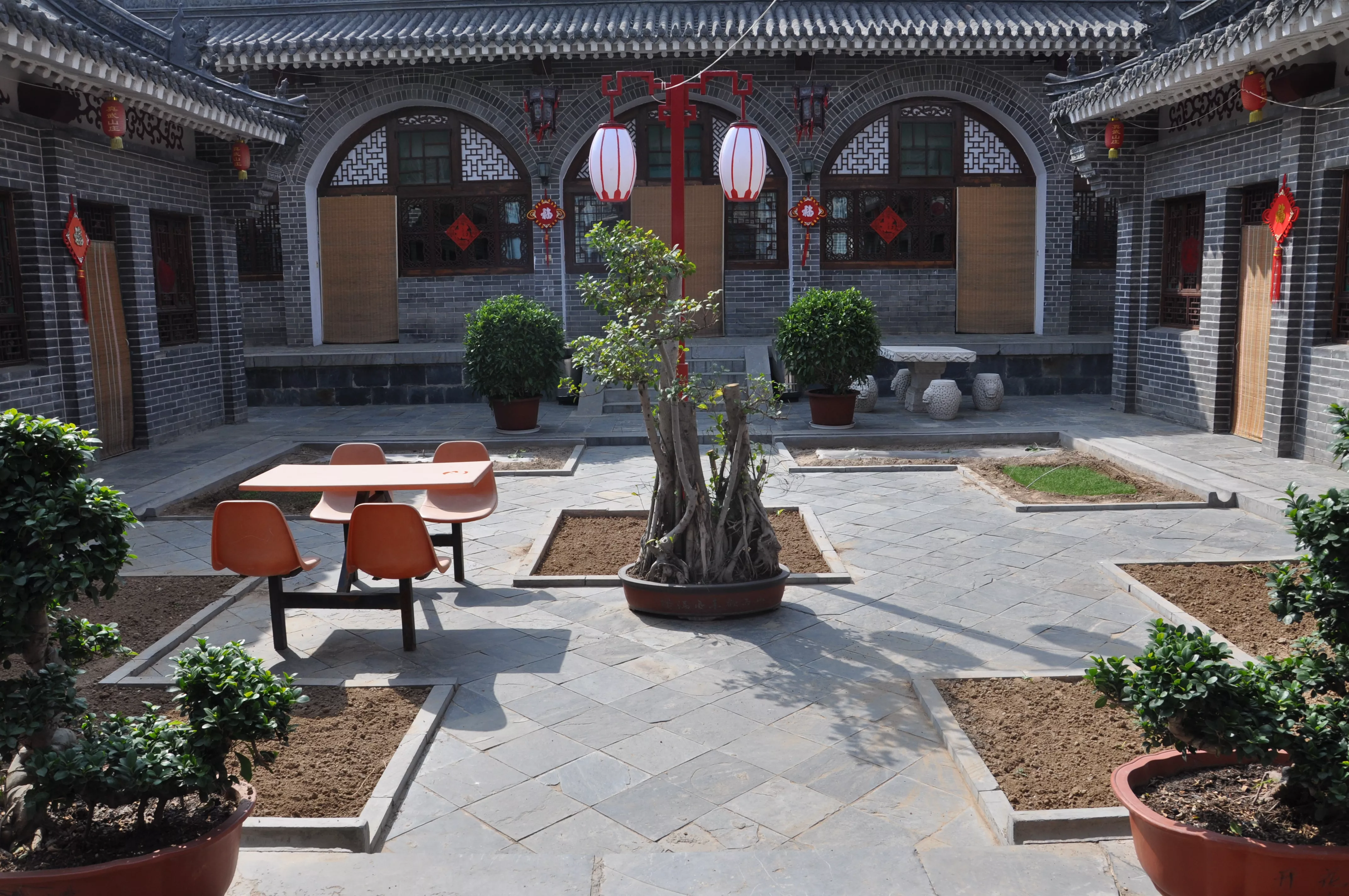 真武山莊由蘭園、竹園、菊?qǐng)@、琴院、棋院、書(shū)院、畫(huà)院七座結(jié)構(gòu)小巧別致、院內(nèi)小徑呈井字形散開(kāi)的小四合院組成。建筑類型是專門體現(xiàn)北方特色的窯洞式火炕型建筑,大四合院也是真武山莊的主要建筑之一,紅色廊柱,繪畫(huà)四襯,有標(biāo)間、套間,內(nèi)部還有乒乓球室、臺(tái)球廳、棋牌室等。院的側(cè)翼建筑是依山傍建的臺(tái)階式,福祿壽禧園,山后是一片核桃林,秋季掛果,游客可在桃林中暢游,感受世外桃園的樂(lè)趣。