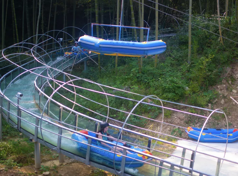 1000m左右的玻璃漂流滑道圍繞在竹海里,坐上橡膠艇一沖而下,跌宕起伏穿梭竹海,仿佛身處綠野仙蹤,大自然真美好?。?/p>