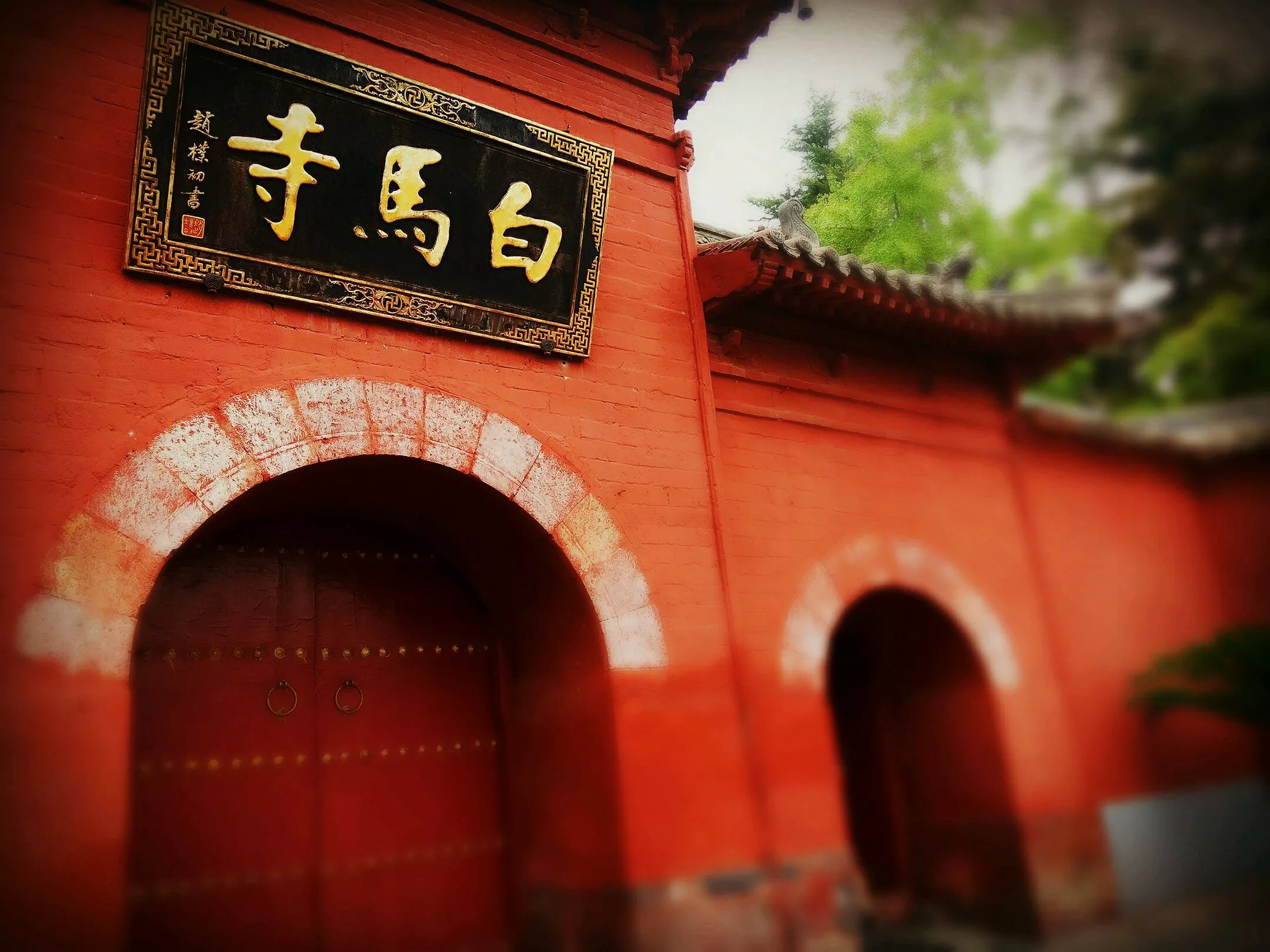 白馬寺山門采用牌坊式的一門三洞的石砌弧券門。“山門”是中國佛寺的正門,一般由三個(gè)門組成,象征佛教“空門”、“無相門”、“無作門”的“三解脫門”。由于中國古代許多寺院建在山村里,故又有“山門”之稱。明嘉靖二十五年(1546) 曾重建。紅色的門楣上嵌著“白馬寺”的青石題刻,它同接引殿通往清涼臺(tái)的橋洞拱形石上的字跡一樣,是東漢遺物,為白馬寺最早的古跡。