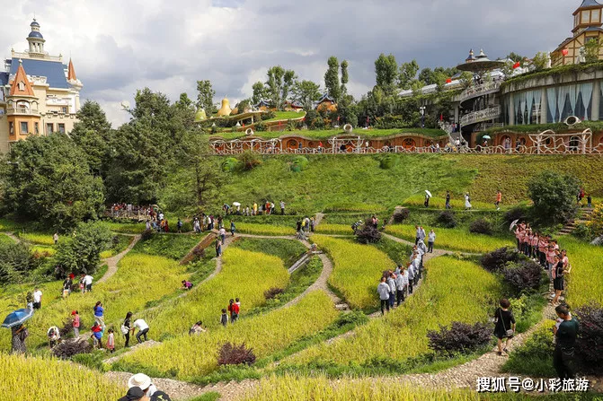 2. 中央花園廣場。進(jìn)入小鎮(zhèn)以后,可以先在中央花園廣場上拍照打卡,這里的草雕藝術(shù)和城堡建筑都會成為你照片里的加分項。但不要在這里浪費太長時間,繼續(xù)往前走,當(dāng)你看到一片瓜果、動物造型的怪屋時,便到了今天行程的第一站——怪屋村商業(yè)街。