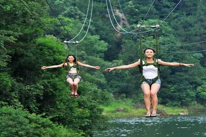 攀上一游,人如春燕展翅入云霄,更似金童玉女下凡來。據(jù)說,天池飛索是華中最長(zhǎng)山水飛索,敢不敢來挑戰(zhàn)自己?
