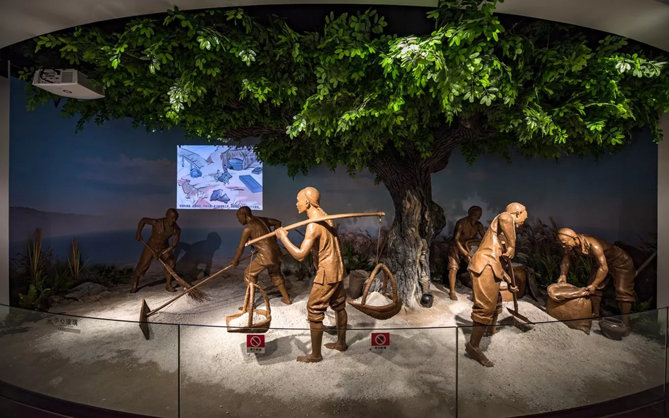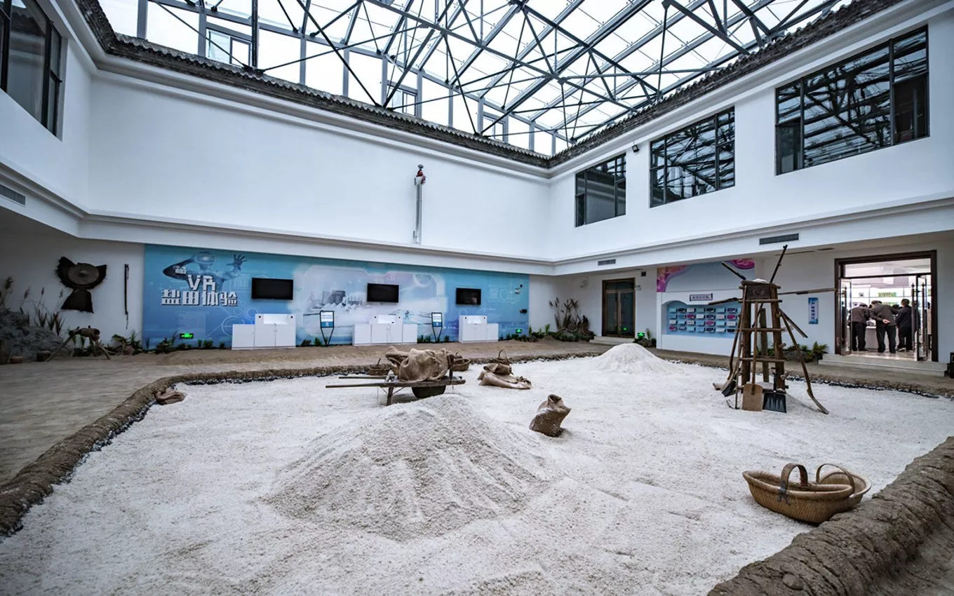布展面積1400平方米,內(nèi)含多個(gè)展區(qū);栩栩如生的鹽雕、博物館采用蠟像、雕塑、沙盤等演示手法,展現(xiàn)古代“煉鹵煎鹽”、“曬鹽”等海鹽生產(chǎn)和鹽民生活的多層文化場景。在鹽文化博物館,不僅能了解深?yuàn)W的鹽文化知識,還能體驗(yàn)鹽田勞作、鹽畫制作、鹽塊3D打印……