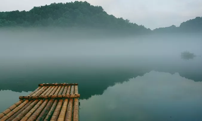 坐在木筏上享受湖面帶來的安靜美景。