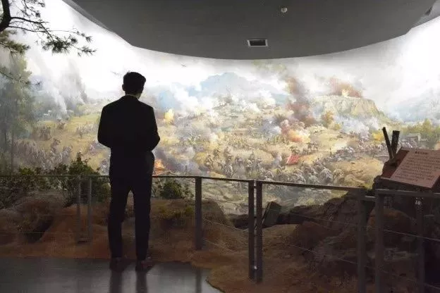 而后我們去到了紀念館里面,序廳為一個八邊形建筑,正墻由三組紅色高浮 雕組成,“血戰(zhàn)羅霄”、“百團大戰(zhàn)”、“抗美援朝”,正中一座圓雕名為解放 戰(zhàn)爭中的彭德懷。正門兩側是兩組主題為“和人民群眾心連心”、“致力于軍隊 的革命化、現(xiàn)代化、正規(guī)化建設”的壁畫。序廳往左,穿過外廊進入三個展廳。