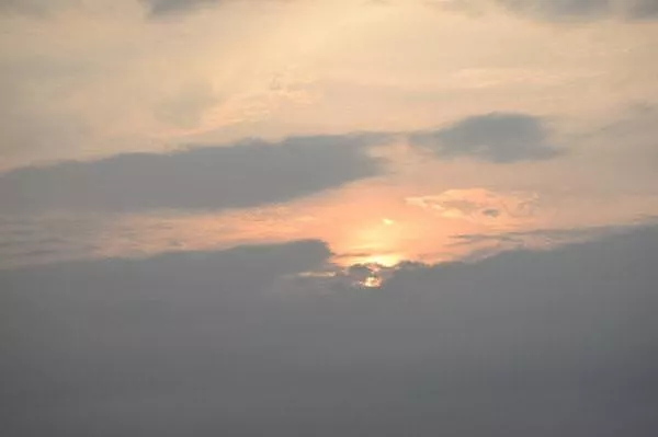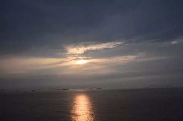 來到六井潭,這里早已有很多人等待。我們屏氣凝神,看著遠遠的天邊突然探出一片紅,將灰色的云彩沖破。緊接著,紅色擴大,天邊仿佛點燃了焰火似的,四散開來。只看到太陽努力鉆出越來越多的縫隙,海面上映出紅色的光束。這便是太陽努力升起的痕跡。