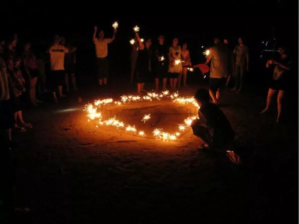 人們把煙火擺成各種樣子,或者是心形,或者是個可愛的小動漫形象,當星火點燃,人們都歡呼跳躍起來。不得不佩服游客里的能讓,居然能設計出各種形象。
