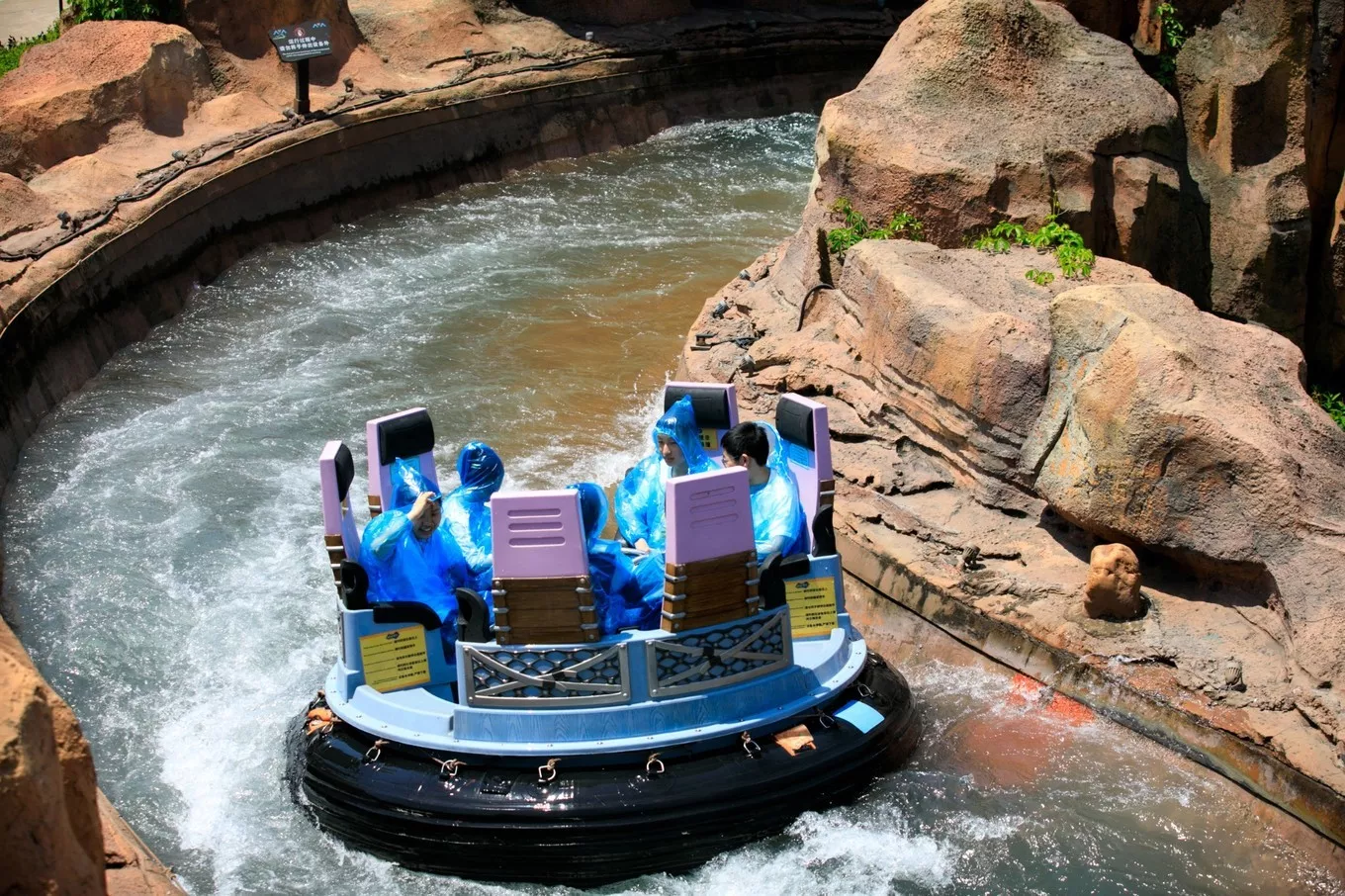 相較于激流勇進(jìn)這類比較刺激的水中項(xiàng)目,峽谷漂流算是比較舒緩的了,全程就像坐水中的觀光車。