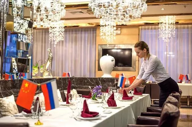 一家餐廳,兩套菜牌。這是一家雙語(yǔ)餐廳,中國(guó)的服務(wù)員都會(huì)說(shuō)俄語(yǔ),餐桌上擺著中? ??兩國(guó)國(guó)旗。這已不是簡(jiǎn)單的一家餐館,更是一個(gè)飲食文化碰撞的交叉點(diǎn)。每年,張紹平都會(huì)組織中俄廚藝大賽,還會(huì)到西歐國(guó)家學(xué)習(xí)新的菜品?!拔蚁M芙o來(lái)綏芬河的人,提供最正宗的俄式西餐。品質(zhì)和性價(jià)比,是我們能夠做大做久的關(guān)鍵所在。”張紹平說(shuō)。