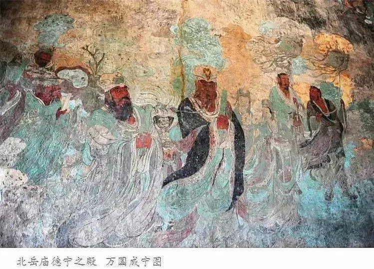 北岳廟最為壯觀的是“德寧之殿”內(nèi)的壁畫了。殿內(nèi)東、西兩壁有唐代畫圣吳道子所畫的“天宮圖”,各高8米,長18米,東壁畫為《云行雨施》,繪有眾多天神興云布雨、為民造福的形象,最大的人物高3.3米;西壁畫為《萬國咸寧》,畫的是眾天神勝利完成任務后偃旗息鼓、得勝回宮的情景。