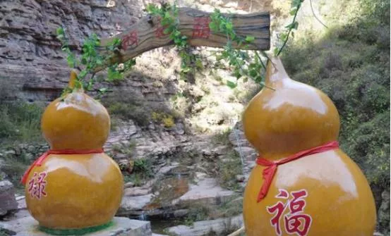 兩個巨大的葫蘆立在路的邊上,分別寫著“?!薄暗摗倍郑昂J”與“福祿”諧音。其藤莖稱作“蔓帶”,與“萬代”諧音。成熟的葫蘆內(nèi)部有很多種子,象征著子孫多多,加上“福祿萬代”,有如此美好的寓意,想必也是景區(qū)特意給游人的祝福。