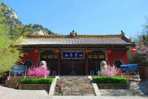 仙堂寺為仙堂山主要古建筑之一,寺依山勢而建,寺址內(nèi)外五泉涌出,故又名“五龍寺”?,F(xiàn)為三進(jìn)院落,中軸線由低向高,層層向上,從溝底登162級天梯到達(dá)山門,兩側(cè)設(shè)鐘鼓二樓。前院東設(shè)關(guān)圣殿(關(guān)公赤面美髯,關(guān)平、周倉持刀侍奉),西為樂樓。前院拾級而上進(jìn)入中院寺門。中殿面闊三間進(jìn)深兩間,五踩斗拱,單檐歇山頂,現(xiàn)辟為法顯紀(jì)念館。兩側(cè)為東西配殿,各五間。由兩側(cè)拾級而上到后院,中為三佛殿,面闊三間,進(jìn)深兩間,斗拱五鋪?zhàn)?,單檐歇山頂,保留著宋代建筑風(fēng)格,兩側(cè)設(shè)東西配殿。西南角設(shè)大殿,寺內(nèi)現(xiàn)存藥師佛、枷藍(lán)佛、燃燈佛、釋迦牟尼佛、彌勒佛等彩色塑像,均為明代遺物。