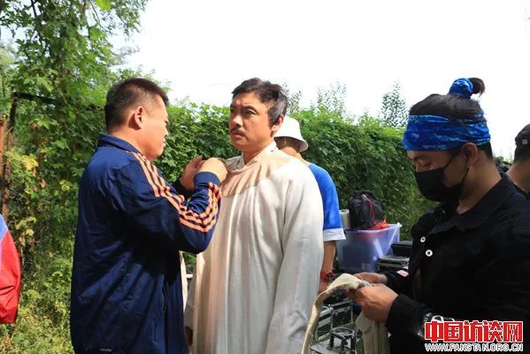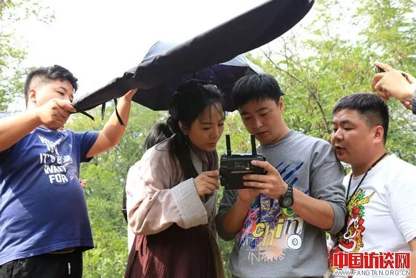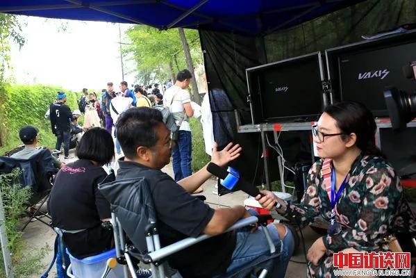 (記者在拍攝現(xiàn)場采訪導演李威)