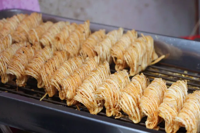 河下古鎮(zhèn)的石板街上,除了巷口有幾家做“茶馓”的小店,幾乎見不到其他商鋪?!安桠獭币矠榛窗伯?shù)氐?a href='/tutechan/' target=_blank>土特產(chǎn),已有百年的歷史了,“鮮不過雜碎,香不過茶馓”,是老淮安人念念不忘的美食。這種用面粉油炸制作的食物,因香軟可口易消化,從前也是女人做“月子”時的必備食物。