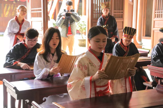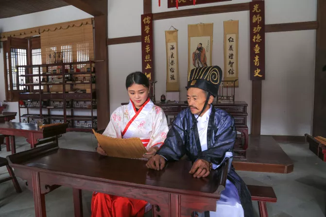同學(xué)們坐下之后,桌子已經(jīng)擺好了竹卷,上面是三字經(jīng)的內(nèi)容,然后學(xué)生跟著老師一起念三字經(jīng),念完三字經(jīng)之后,來(lái)了一個(gè)小插曲,一個(gè)讀書不用功的富家子弟跟老師之間產(chǎn)生各種搞笑奇葩的對(duì)話,也是對(duì)整個(gè)課堂帶來(lái)了一些樂趣。
