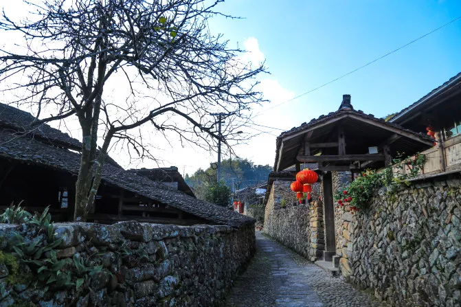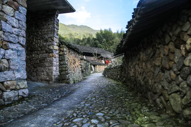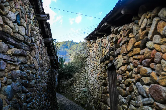 這里有別具特色的石砌民居群落,深垟?shù)漠屆裨旧钤诎肷窖?,移居山腳時(shí)便就地取材,用石頭建設(shè)新家園,家家房屋、戶戶院墻,乃至田埂、道路都用石頭磊成,古老建筑存留至今,為深垟贏得了“石頭城”的美譽(yù)。