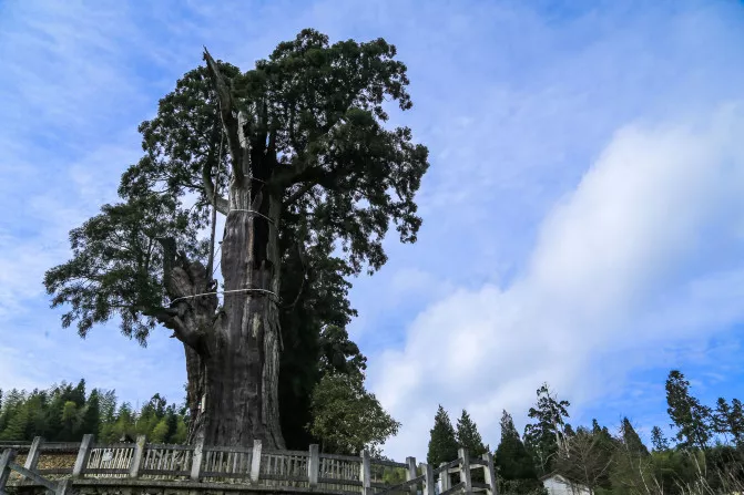 時(shí)思寺前有長(zhǎng)達(dá)百米的“古柏長(zhǎng)廊”和“柳杉王”,柳杉王遭雷擊成空,內(nèi)可容納20余人,胸徑4.47米,為全國(guó)之最。