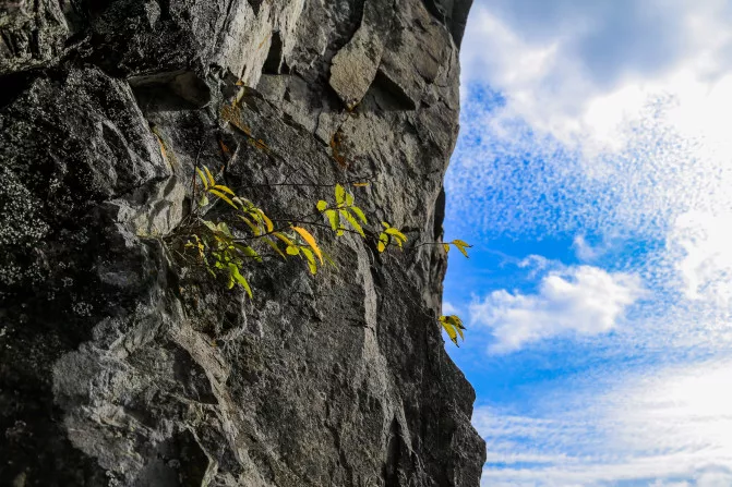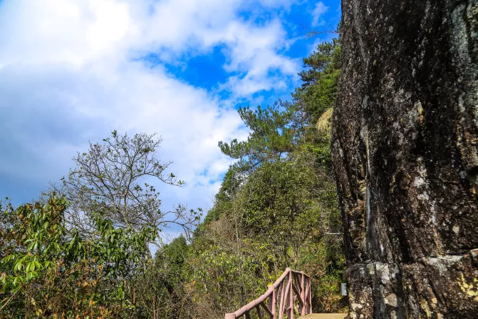 我沿著山道扶手往下走,一路上陪伴我的是悅耳的鳥鳴聲和風(fēng)過(guò)樹葉沙沙的響聲,在這深山老路上,只有我一個(gè)人獨(dú)行,未見其他游客,許是這個(gè)季節(jié),鮮少有游客來(lái)此處,曲曲折折的山道帶著我上行下尋,終到了雪花漈。只是它與我想象中的不一樣,我沒有看到滿天的瀑布從高處落下。而是很安靜,在陡峭的山壁之上,只有一股小小的支流靜靜流淌著,也難怪我一路上未聽見淙淙的流水聲,這個(gè)季節(jié)的瀑布也是干涸的,你甚至都找不到雪花漈的任何蛛絲馬跡,雖然未見雪花漈飛瀑如雪,有點(diǎn)遺憾,但是我不阻礙我看風(fēng)景的心情。