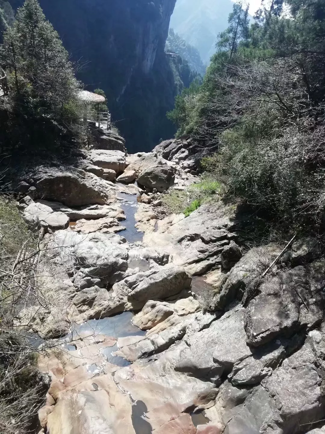 我順著山道上行,行到一處,地勢(shì)比較高,左側(cè)巖壁比較突出,道路便顯得狹小,我小心翼翼的從這里走過(guò),上去便有個(gè)觀瀑亭正好坐在亭子里休息下,保存點(diǎn)體力,亭子之外有一塊突起的大石塊它有個(gè)形象生動(dòng)的名字叫如來(lái)掌,就像人一掌劈開的模樣故得名如來(lái)掌。站在高處,吹著愜意的山風(fēng),腳下便是蜿蜒曲折的山道?;剡^(guò)頭才發(fā)現(xiàn)自己不經(jīng)意間走了這么多路,就像人生,每走一步,你都會(huì)留下一個(gè)印記,直到走滿人生的一百步,人生才得以圓滿。