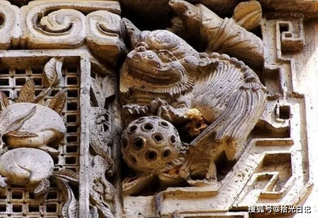 這一幅磚雕卷軸講述的是張良拾履,三見(jiàn)黃石公的故事,最終獲得了黃石公贈(zèng)予的太公兵法,這也讓張良一度成為了劉邦的軍師。九獅滾球獅頭被破壞了,但是繡球還是完整的。