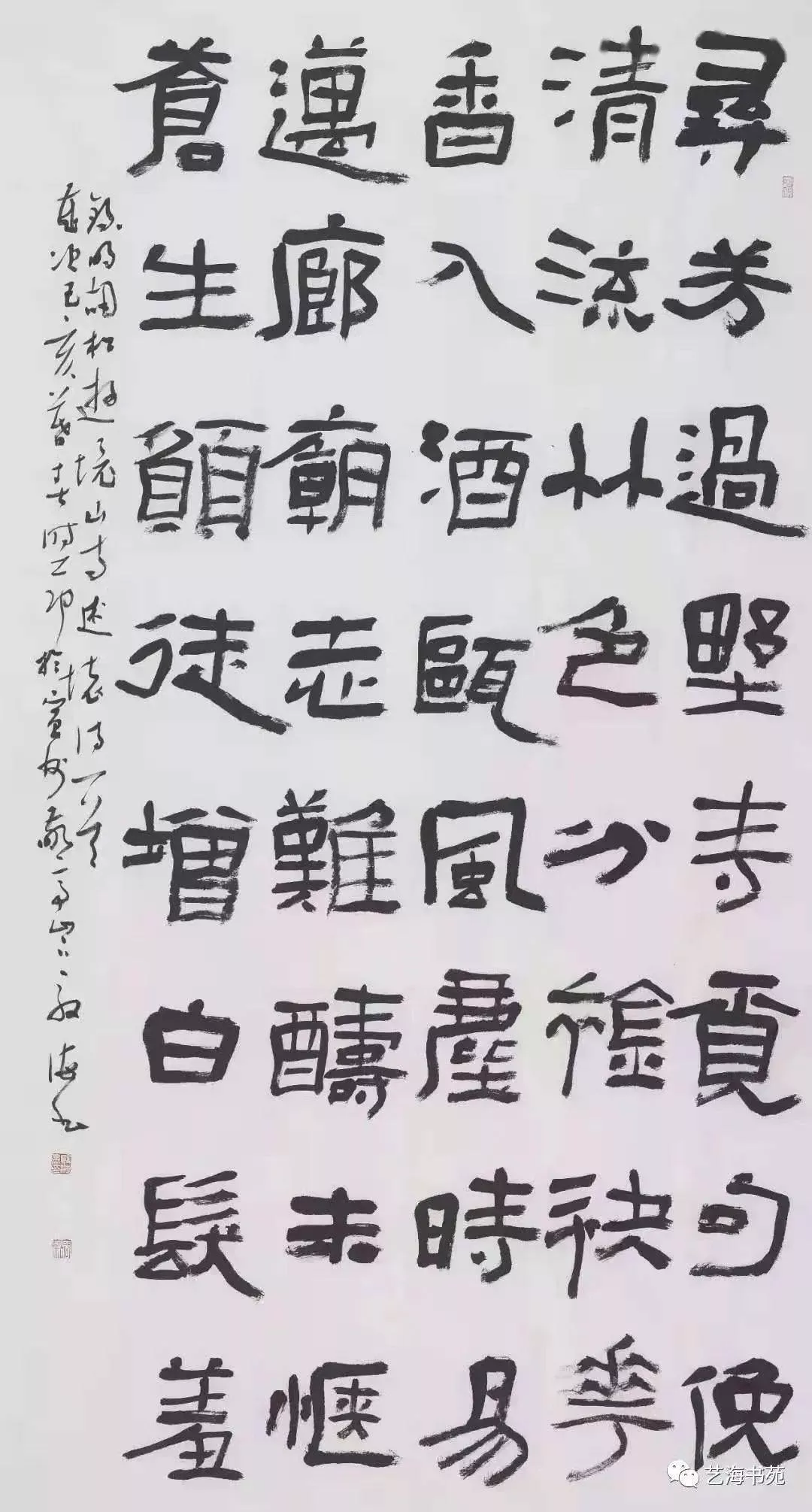 隸書《胡松<游境山寺述懷>詩》入展第六屆全國畫院美術(shù)作品展,主辦單位:中國國家畫院。作品采用大字隸書在八尺宣紙上豎式書寫,風(fēng)格上糅合了《石門頌》、《西峽頌》、《張遷碑》等經(jīng)典漢碑元素,力求飽滿厚重、蒼茫渾樸的藝術(shù)效果。