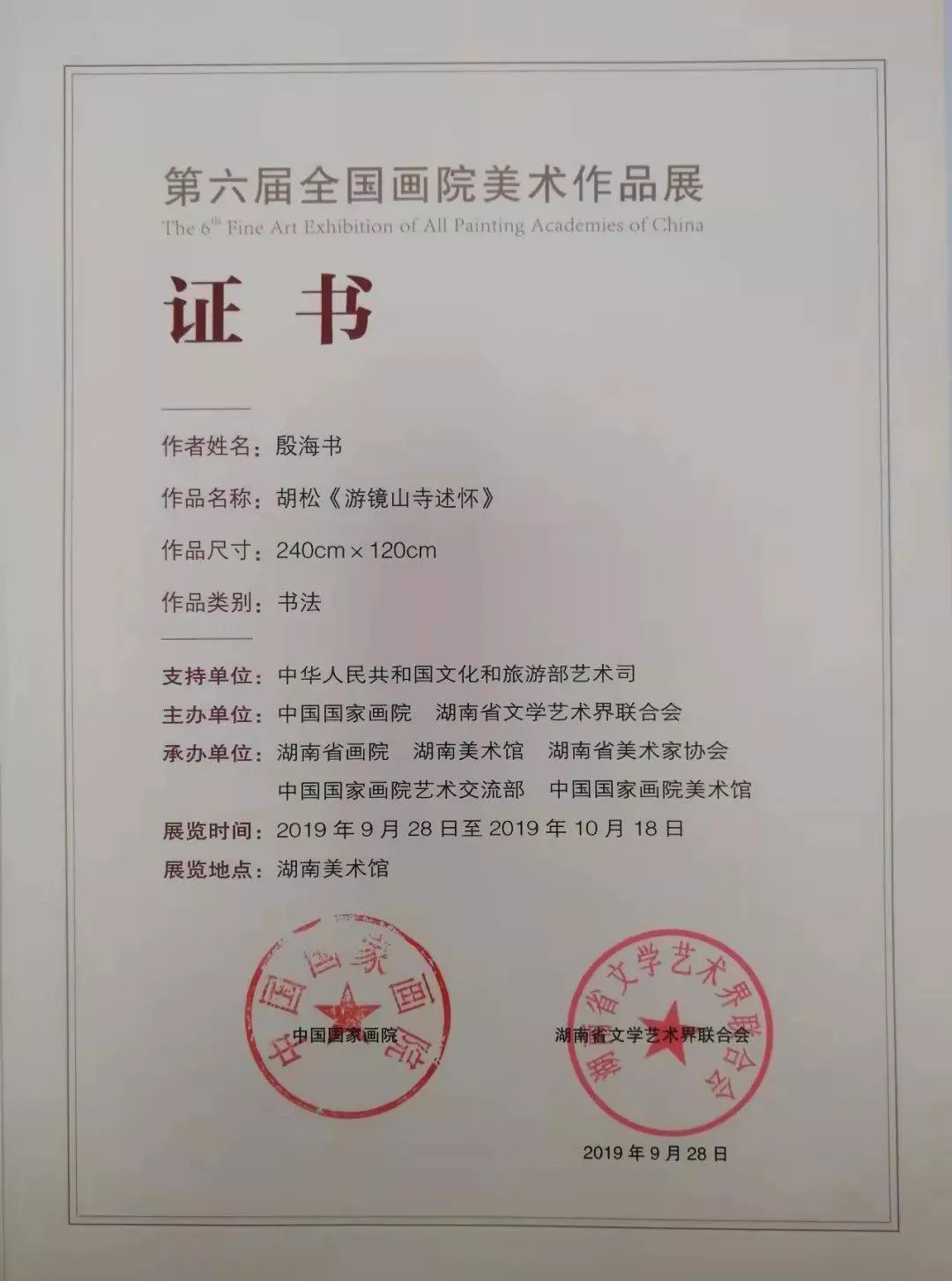 殷海書,中共黨員,中國書法家協(xié)會會員,國家二級美術(shù)師,安徽省書法家協(xié)會理事,安徽省書法家協(xié)會隸書委員會委員,鴻達(dá)書社副社長兼秘書長,宣城市文聯(lián)委員,宣城市書法家協(xié)會副主席,宣州區(qū)書法家協(xié)會主席,宣州區(qū)書畫院院長。先后獲得“宣城市第五批拔尖人才”、“宣城市首批宣傳文化領(lǐng)域拔尖人才”、安徽省書法家協(xié)會“皖軍100強(qiáng)”、“安徽省百名富有發(fā)展?jié)摿Φ膬?yōu)秀中青年書法人才”、“皖軍書法隸書20家”等榮譽(yù)稱號。
