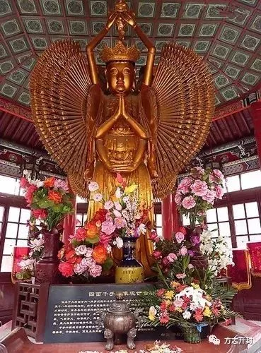 千手千眼佛坐落在八角琉璃殿中間的一座平臺(tái)上。這是一尊四面完全相同的立體雕塑,無(wú)論站在東西南北哪個(gè)方位上,都能清清楚楚地看到她那慈祥、端莊而美麗的面容。她渾身上下金光閃閃,顯得華貴而樸實(shí)。她除了與常人一樣長(zhǎng)著圓潤(rùn)的手臂外,特別令人注目的是,從肩頭上斜逸出4組小手掌排列而成的翅膀,每個(gè)小手的掌心里都有一只晶瑩發(fā)光的眼睛。