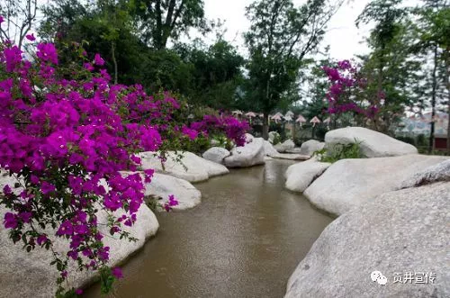 本組景點展現的是千年鹽都自貢最具特色的鹽文化鹽井架和鹽泉,是極具地方特色和歷史內涵的一組景點。古樸的經歷無數風霜雪月的木井架矗立在繁花似錦的半山上,仿佛在講述那千年的鹽文化歷史,并與現代園林鮮花藝術巧妙結合,相映成趣。