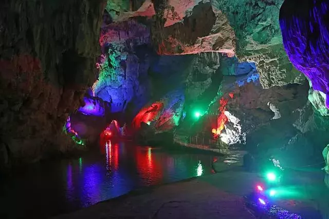 這里山林聳立,綠樹(shù)環(huán)繞,步入景區(qū)大門(mén)不久后便可看到一道高幾百米的拱門(mén),而兩側(cè)均是平整的山壁,這就是景區(qū)中有名的“迎賓石門(mén)”。至此可沿著玻璃棧道步行于懸崖之上,然后通過(guò)景區(qū)內(nèi)的游覽棧道走過(guò)上洞、中洞、下洞,途中可欣賞到那條一水穿三洞的天然暗河。下洞便是溶洞美景所在之處,形態(tài)各異的鐘乳石在五彩斑斕的燈光照耀下,顯得絢麗多彩。欣賞完鐘乳石美景后,乘坐洞口的游船便可暢游在這暗河之上,穿梭在兩岸崇峰峻嶺之間,欣賞石門(mén)仙湖的湖光水色。
