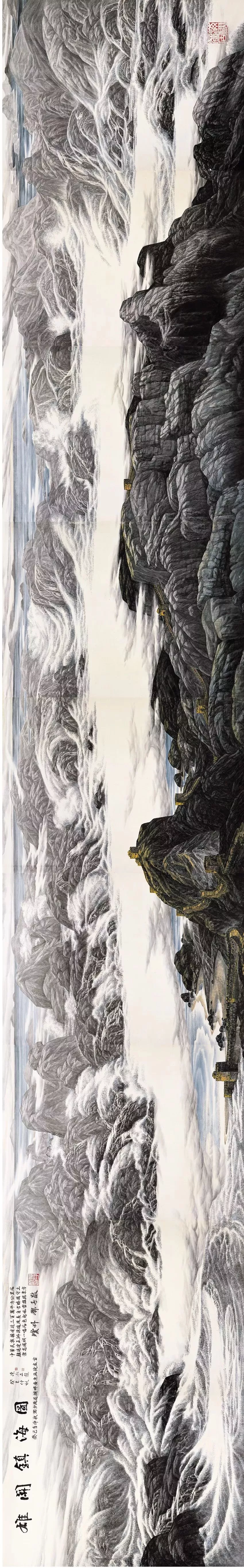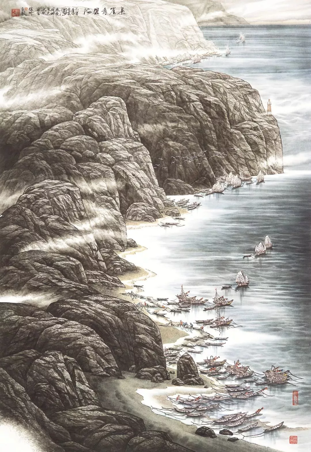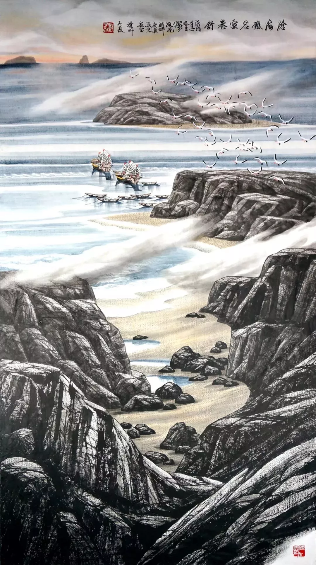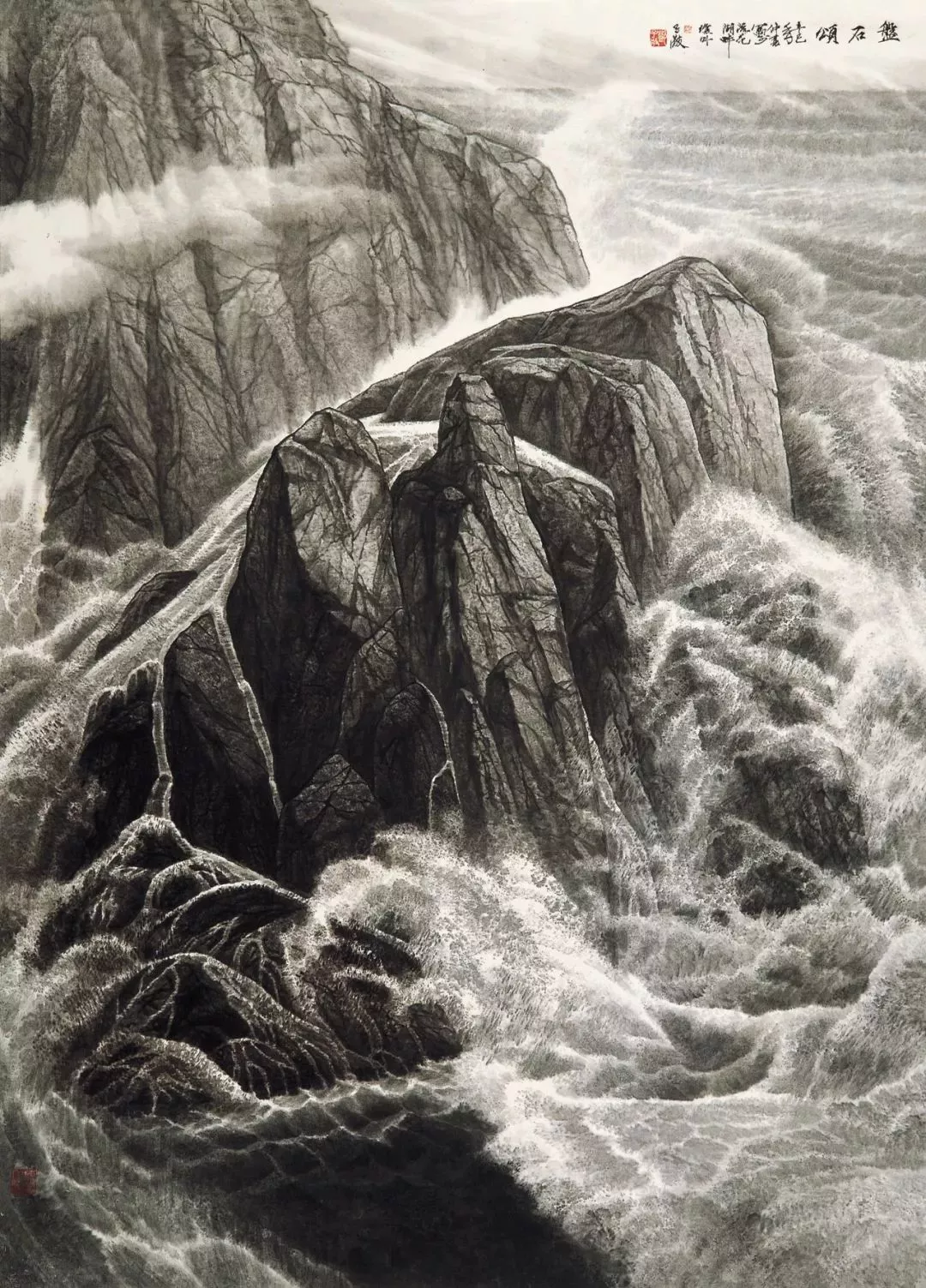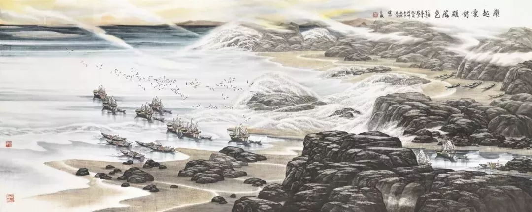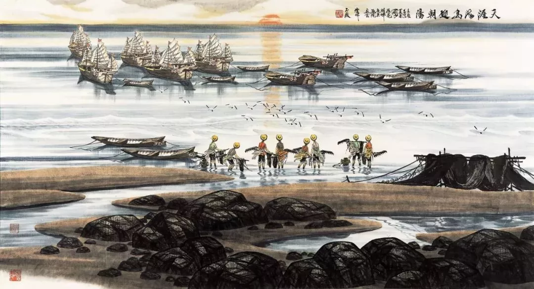 他說“那里有我的?;辏形易鳛橐粋€藝術(shù)家的夢想和心靈歸宿——它是我的精神家園。畫海,挑戰(zhàn)這一前所未見的領(lǐng)域,亦是碰撞前所未有的機(jī)遇”,于是,通過象征性把筆墨技巧強(qiáng)化到精神家園的層次,中國畫壇的視野里出現(xiàn)了海的系列:《盤石頌》《波光巖峻》《石島》《風(fēng)帆》《春潮》《多姿的海灣》《大浪淘沙》《激流》......