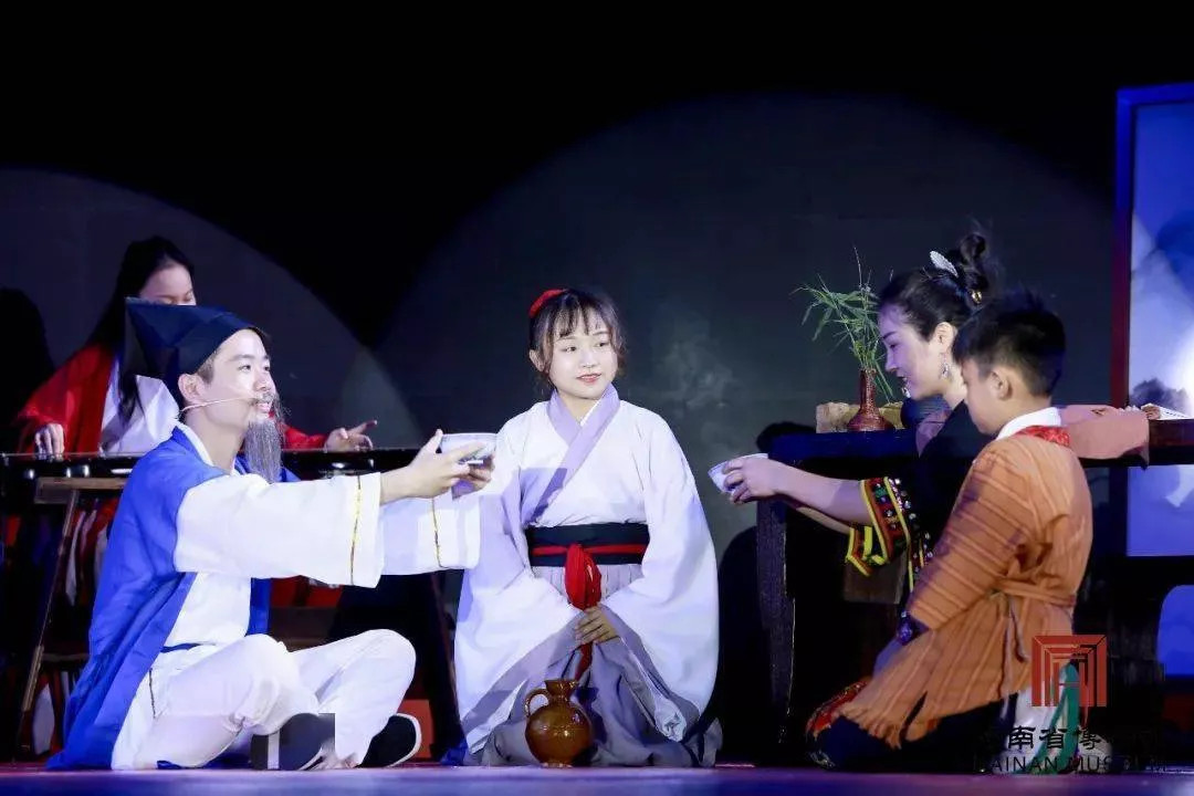 活動以音舞詩畫《筑夢十二時辰》表演拉開晚會活動序幕,全面展現(xiàn)南溟奇甸里的千年守護(hù)——薪火傳承。詩詞情景劇《東坡儋耳·琴詩懷古》,再現(xiàn)了宋代大詩人蘇東坡海南島上興辦學(xué)堂、講授詩書禮儀,傳播中原文化,為海南的文教事業(yè)做出了不可磨滅的貢獻(xiàn)。瓊劇名角陳素珍首次現(xiàn)身海南省博物館舞臺,和她的搭檔帶來瓊劇片段演唱《春草闖堂—贈銀》,此外,鼻蕭、織錦、炭畫等手藝人相繼登上舞臺。
