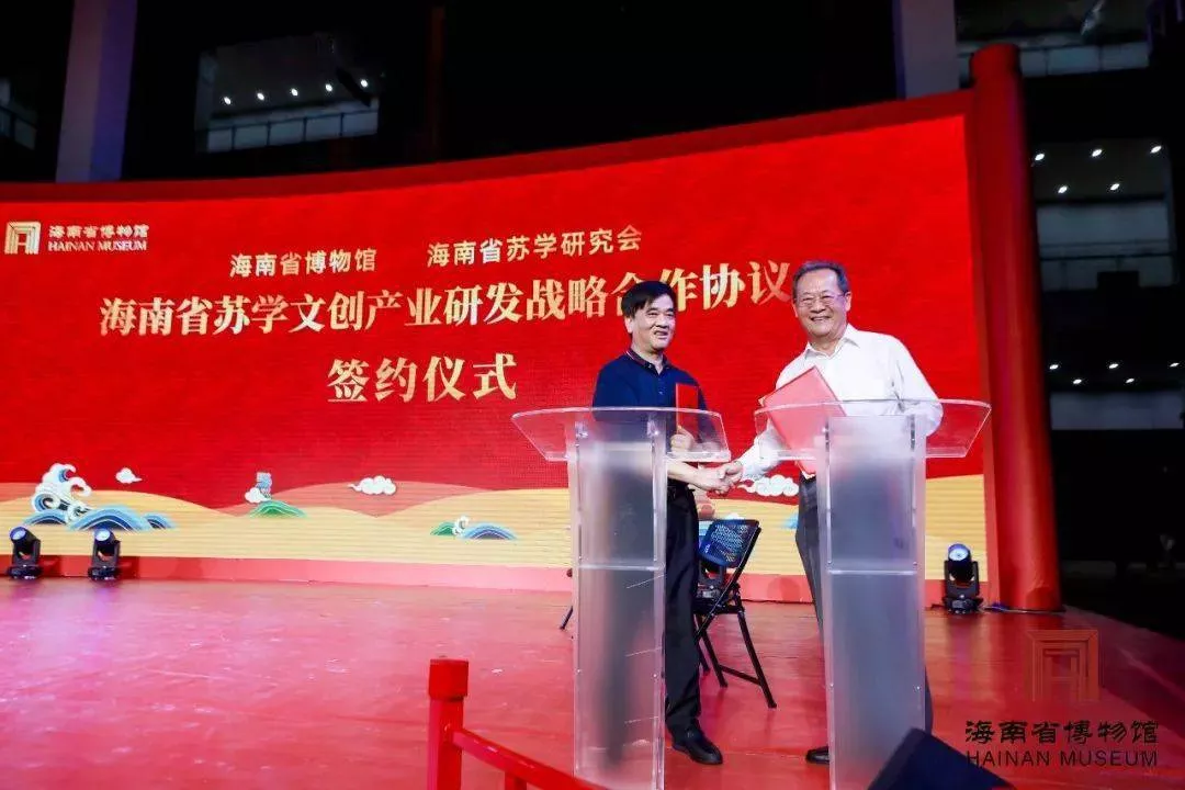 活動現(xiàn)場,海南省博物館館長陳江、海南省新聞工作者協(xié)會副主席李公羽、海南省蘇學(xué)研究會副會長海濱一起探討“文物+旅游 博物館可以走的更遠(yuǎn)”。同時,海南省博物館與海南省蘇學(xué)研究會舉行了海南省蘇學(xué)文創(chuàng)產(chǎn)業(yè)研發(fā)戰(zhàn)略合作協(xié)議簽約儀式。
