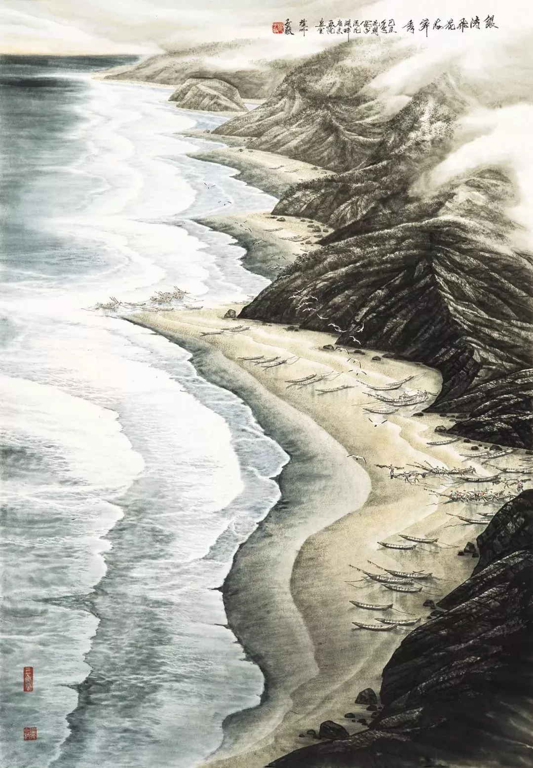 中國畫的技法精髓說到底是點與線的完美結(jié)合。在說到點的時候,我們不能疏忽“皴、擦、鉤、斫、點”六字。有人注意到子敬畫海鉆研出的技法“點皴聚沙”。他不滿足用簡約干練的幾筆淡墨素彩來寫海,傾情于海的雄渾大氣,用點出自機(jī)杼,宛如以木刻的刀法點點似錐畫沙,碾平趨立,力透紙背。單以皴法而言,他獨創(chuàng)的“沙點皴”有別于古法的“雨點皴”和“米點皴”,皴法隨手擦來,墨漬或沉或染,山體和沙灘在點皴漬染的過程中,前者顯得蒼而不枯,潤卻不綿,后者更是肌理豐富,質(zhì)地潤澤,在遠(yuǎn)山、近沙、空間、感覺的動感韻律中呈現(xiàn)出勃勃生機(jī),使畫面構(gòu)成一種特殊效果。