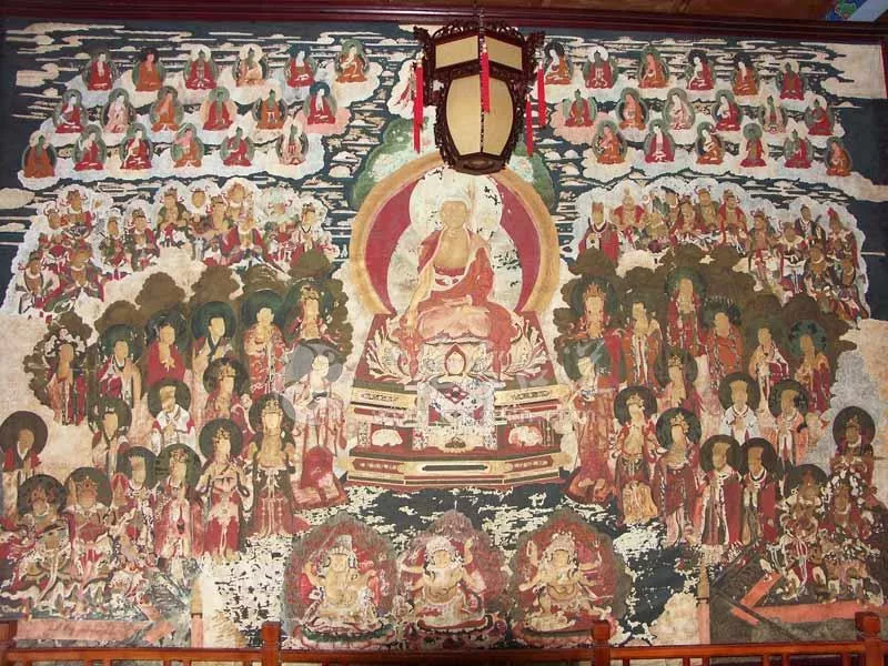 《如來(lái)會(huì)佛圖》,繪于大寶積宮中,畫(huà)像正中端坐著朱衣金身的如來(lái)佛,上列十八尊者,兩側(cè)為道教各神像,下列正中是喇嘛教三位護(hù)法金剛神,外側(cè)為四大天王全畫(huà)繪有10 0余位神像,把佛教和道教的各種人物都集中在一起,人物形象生動(dòng),動(dòng)靜結(jié)合和諧,構(gòu)圖層次分明,色彩艷麗明快。據(jù)研究,這幅繪制精細(xì)、用筆流暢、線條勻稱(chēng)的壁畫(huà),具有明顯的藏畫(huà)風(fēng)格特點(diǎn)。不過(guò),它卻是漢、藏畫(huà)家聯(lián)袂合作的結(jié)果。