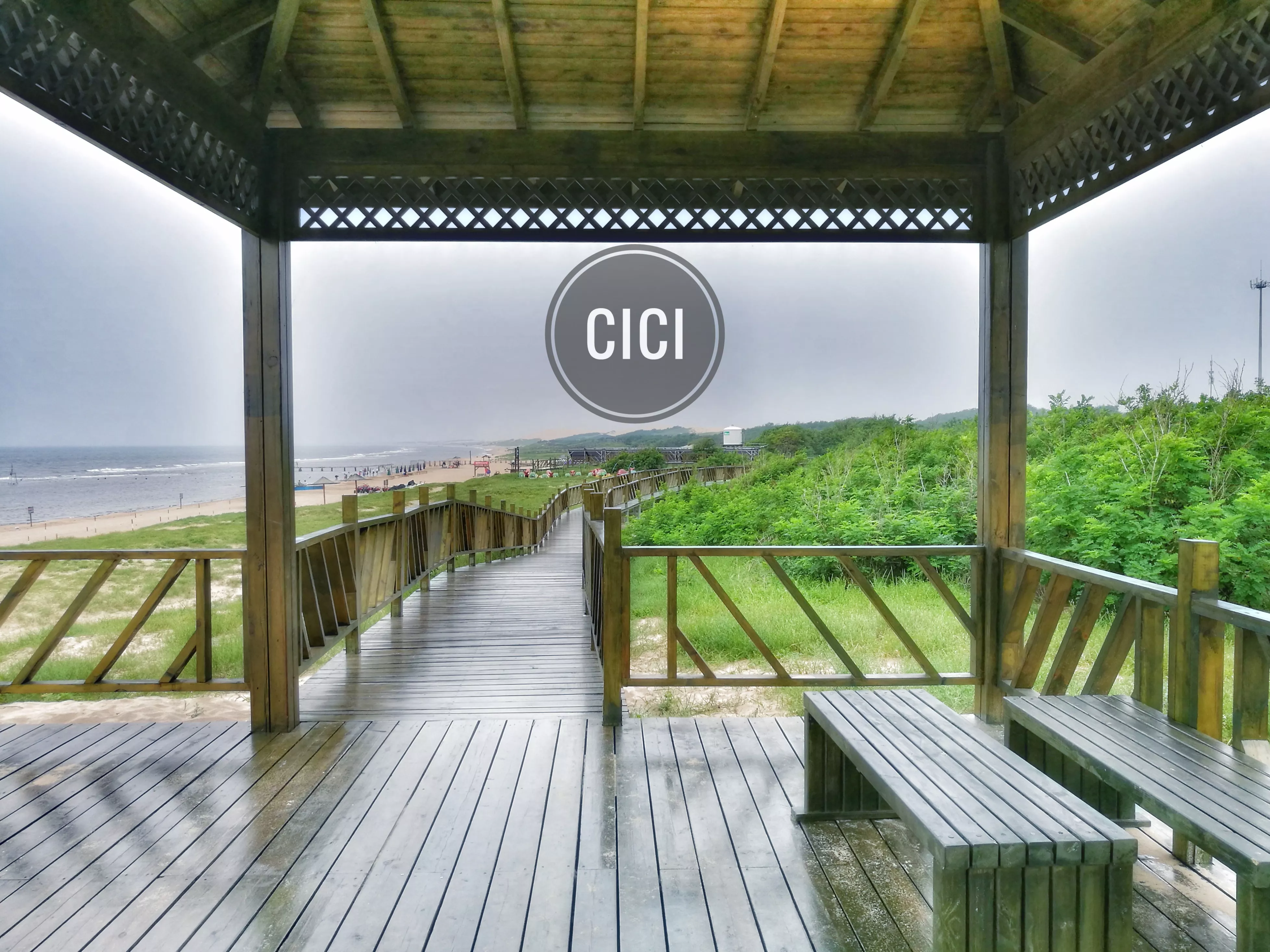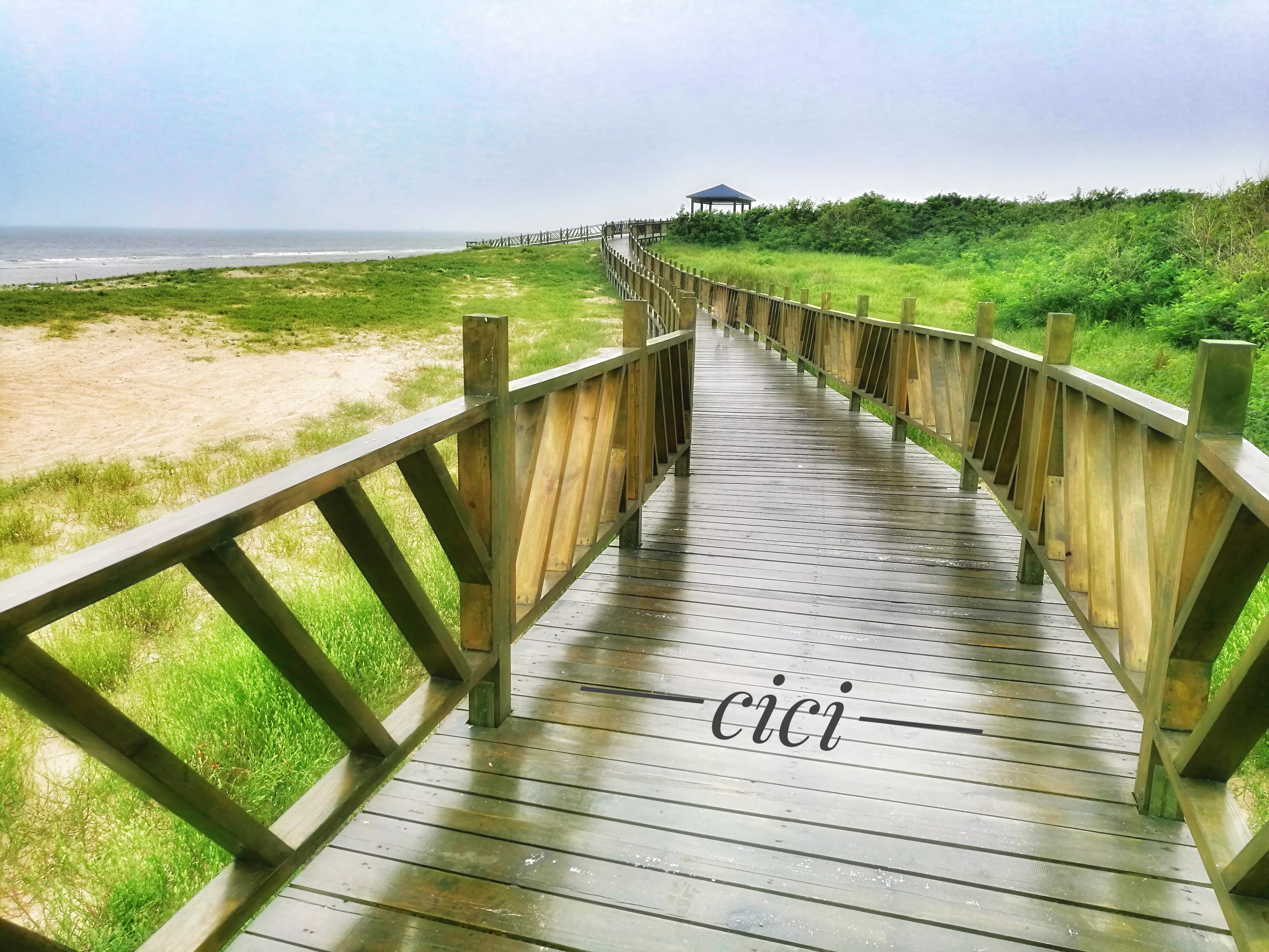 這里沙細(xì)、濰緩、水清、潮平。進(jìn)入景區(qū),左邊就是一望無際的大海,海灘上厚厚的細(xì)沙,走起路來很困難。右邊是連綿起伏的沙丘和大片的綠植,沙丘上人性化的修了一條人行木棧道,往遠(yuǎn)處看像一條巨龍又像小長城伸向遠(yuǎn)方。木棧道又干凈又好走,隔一段就有一個休息亭,還有一個通向海邊的木梯,從遠(yuǎn)處看好像是長城烽火臺