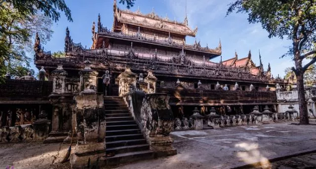 簡(jiǎn)介:金色宮殿僧院是曼德勒少有的純柚木僧院之一,位于固都陶佛塔南面不遠(yuǎn)處。這座建筑不僅是傳統(tǒng)緬甸木構(gòu)建筑的一個(gè)范例,也見(jiàn)證過(guò)一段皇室故事。最初這座建筑位于皇宮之中,是敏東王和皇后的寢宮,敏東王最后也是在這里駕崩的。他的繼任者Thibaw王為避諱,將整座建筑拆遷。