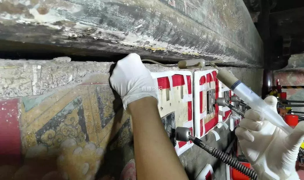 歷經(jīng)數(shù)百年歲月的洗禮,平武報(bào)恩寺壁畫和彩塑出現(xiàn)了多種病害——壁畫支撐體后傾、空鼓脫落、開(kāi)裂,彩塑受地震影響和自身重力影響產(chǎn)生不同程度的外傾現(xiàn)象,造成了空鼓、開(kāi)裂、彩塑脫離墻體等問(wèn)題。