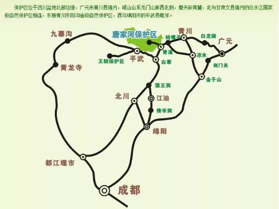 唐家河國(guó)家級(jí)自然保護(hù)區(qū)是我省建立較早、建設(shè)較好、具有較大影響力的自然保護(hù)區(qū),也是我國(guó)首批國(guó)家示范自然保護(hù)區(qū)之一。是以保護(hù)大熊貓、川金絲猴、扭角羚及其棲息地為主要保護(hù)對(duì)象的森林生態(tài)系統(tǒng)和野生動(dòng)物類(lèi)型自然保護(hù)區(qū)。位于四川北部廣元市青川縣之西北角,地處四川盆地北緣,龍門(mén)山西北側(cè),摩天嶺南麓,北連甘肅省文縣境白水江國(guó)家級(jí)自然保護(hù)區(qū),西鄰綿陽(yáng)市平武縣,東南與四川東陽(yáng)溝省級(jí)自然保護(hù)區(qū)、青川縣青溪鎮(zhèn)、橋樓鄉(xiāng)、三鍋鄉(xiāng)接壤。幅員面積400平方公里,合40000公頃。其中核心區(qū)面積27153.87公頃,緩沖區(qū)3798.30公頃,實(shí)驗(yàn)區(qū)9047.83公頃,森林覆蓋率94.73℅,平均負(fù)氧離子含量:4890個(gè)/cm3。地勢(shì)略呈三菱形,西北高,東南低,大草坪最高海拔3837米,白果坪保護(hù)站最低海拔1150米,高差懸殊,山勢(shì)陡峭,河谷深切,屬侵蝕構(gòu)成的中高山地貌。氣候類(lèi)型屬亞熱帶季風(fēng)氣候,差異較大,垂直變化明顯,雨量充沛,夏涼冬長(zhǎng)。海拔和氣候的差異造成了唐家河豐富的動(dòng)植物種類(lèi),也成為全球生物多樣性保護(hù)的熱點(diǎn)地區(qū),計(jì)有高低等植物267科998屬2629種,屬?lài)?guó)家重點(diǎn)保護(hù)(一級(jí)保護(hù))的珍稀植物有珙桐、光葉珙桐、紅豆杉、銀杏計(jì)4種。昆蟲(chóng)有580種(無(wú)脊椎動(dòng)物),脊椎動(dòng)物有471種,其中獸類(lèi)103種,鳥(niǎo)類(lèi)310種,兩棲類(lèi)23種,爬行類(lèi)27種,魚(yú)類(lèi)9種。屬?lài)?guó)家重點(diǎn)保護(hù)(一級(jí)保護(hù))的獸類(lèi)有大熊貓、川金絲猴、扭角羚、豹、云豹、林麝、馬麝7種,一級(jí)保護(hù)鳥(niǎo)類(lèi)白尾海雕、胡兀鷲、金雕、斑尾榛雞、紅喉雉鶉及綠尾虹雉6種,在第四次全國(guó)大熊貓調(diào)查中,唐家河共有野生大熊貓39只,與甘肅白水江和四川王朗、東陽(yáng)溝、小河溝等自然保護(hù)區(qū)共同構(gòu)成岷山北部大熊貓棲息地,是連接岷山山系北部大熊貓種群的重要走廊地帶和大熊貓重要的避難所。被中外專(zhuān)家譽(yù)為:“大熊貓的樂(lè)土”、“生命家園”“天然基因庫(kù)”和“岷山山系的綠色明珠。