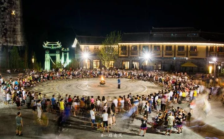 晚上八點,錦雞廣場的篝火晚會正式開始,身穿民族服飾的演藝人員為現場游客呈現一場融歌舞、口技等民族特色于一體的篝火晚會,精彩不斷,高潮處還會與游客進行互動并跳篝火舞。
